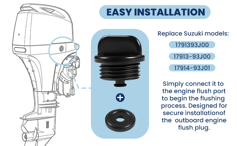 COMPATIBILITY: The Outboard Rinse Hole Cap is compatible with Suzuki 4 stroke marine outboard engines 1791393J00. It includes 1 set flush plug kit, comprising 1 x rubber gasket and 1 x flush plug.