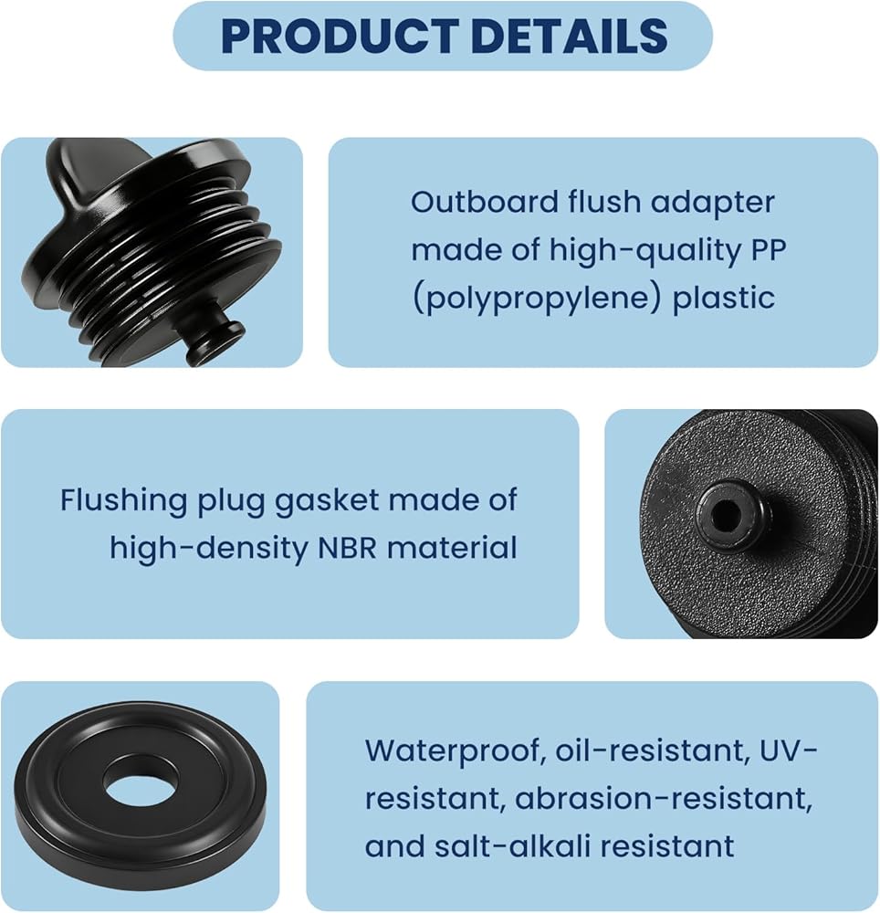 HIGH QUALITY: Outboard flush adapter made of high-quality PP (polypropylene) plastic, Flushing plug gasket made of high-density NBR material, Can provide good waterproof, oil resistant, UV-resistant, abrasion-resistant, and salt-alkali resistant properties. It is designed for long-lasting performance, withstand the harsh marine environment and can withstand repeated use without damage or wear.