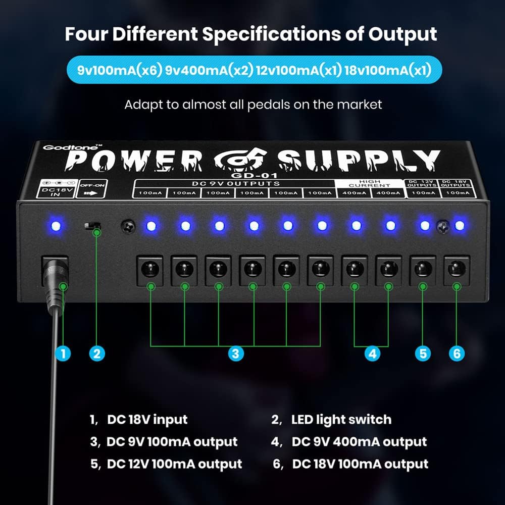 1: If the output current and power supply voltage exceed the pedal, the pedal may generate noise. So please make sure that your pedal current and voltage are the same as the output port of the power supply.