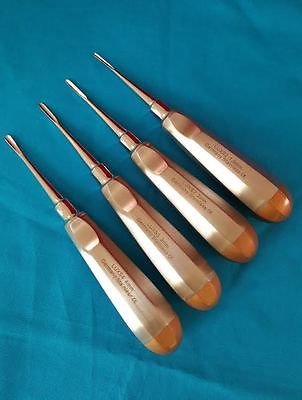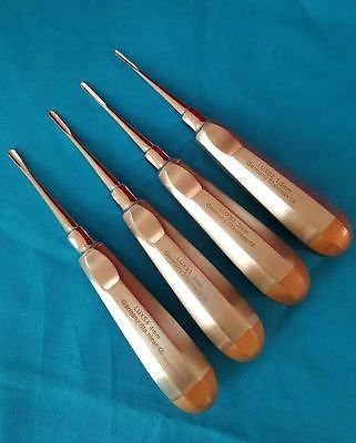 GERMAN STAINLESS STEEL ITEM: SET OF 4 DENTAL ELEVATORS Luxating Elevators are designed to make extractions as trauma free as possible by cutting the periodontal ligament while easing the tooth from the socket. The result is less tissue damage that promotes quicker healing and fewer complications. Luxating Elevator is used by rocking and cutting rather than by lifting and prying the way a conventional elevator is used. The patterns include both straight blades ranging from 1.5mm to 4mm in leng SET INCLUDES ONE EACH OF THE FOLLOWING: 1 EACH LUXATING ELEVATOR,STRAIGHT 1.5MM (DEL LUX-S1.5) 1 EACH LUXATING ELEVATOR,STRAIGHT 2MM (DEL LUX-S2) 1 EACH LUXATING ELEVATOR,STRAIGHT 3MM (DEL LUX-S3) 1 EACH LUXATING ELEVATOR STRAIGHT 4MM (DEL LUX-S4)