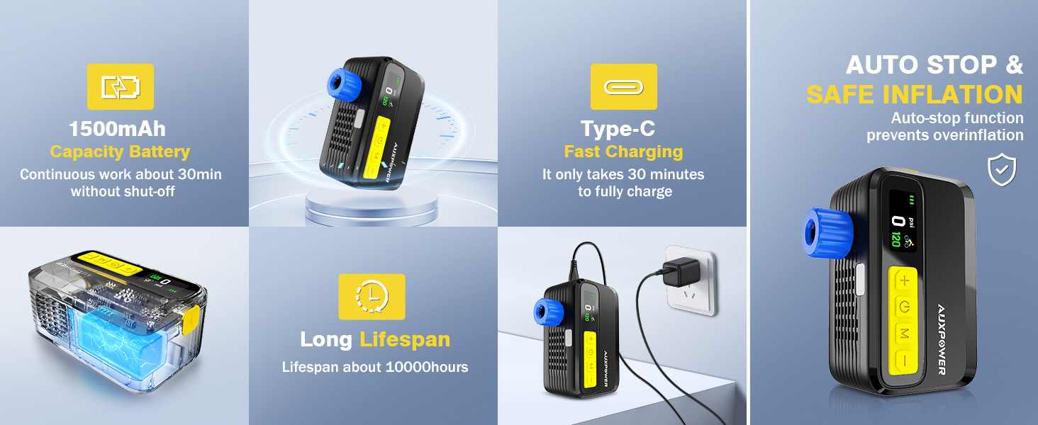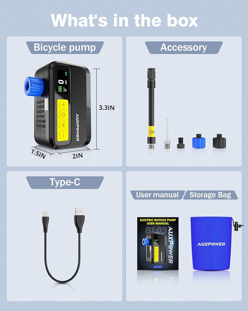 【User-Friendly Bicycle Pump】Auxpower bike pump informed with the inflation progress bar and enjoy a full charge in just 30 minutes. Compatible with both Presta and Schrader valves, this portable bike pump with gauge is versatile for all bicycle tires. Its rechargeable battery and compact design make it a must-have for cyclists.