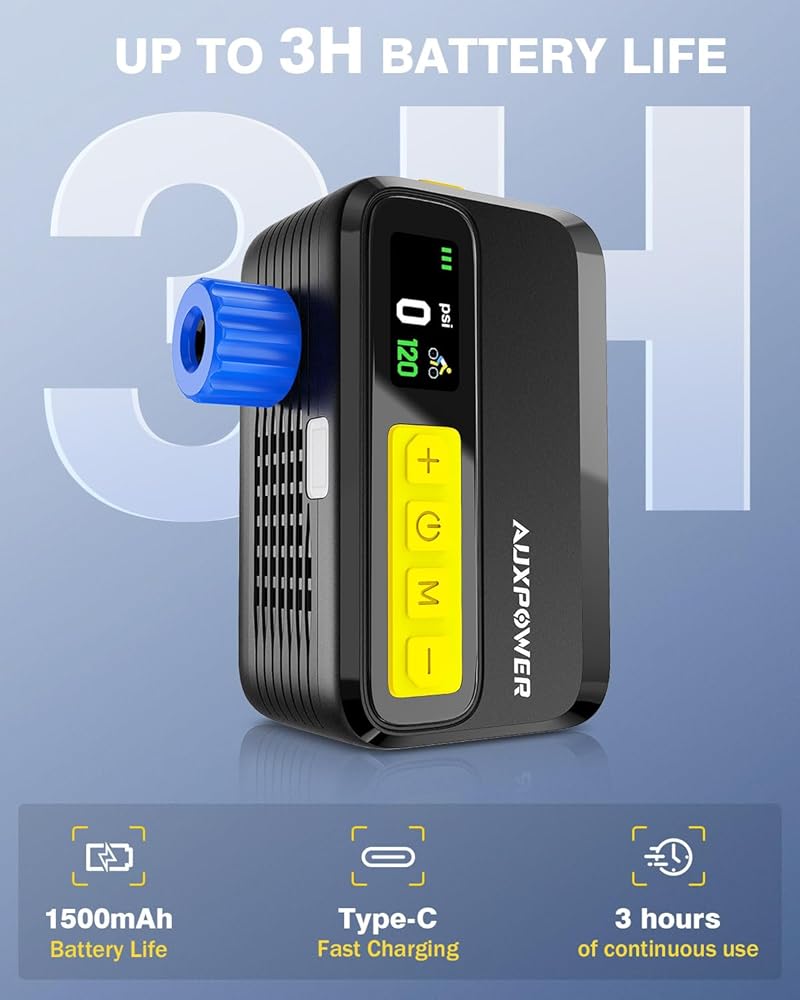【Experience Rapid Inflation】 Auxpower electric bike pump featuring a 1500 mAh battery and 120 PSI capacity. The brushless motor ensures efficient performance, delivering 25-28 L/min wind speed for quick tire inflation. Perfect for road bikes, MTB bikes, and more, this mini bicycle pump is your go-to portable solution.