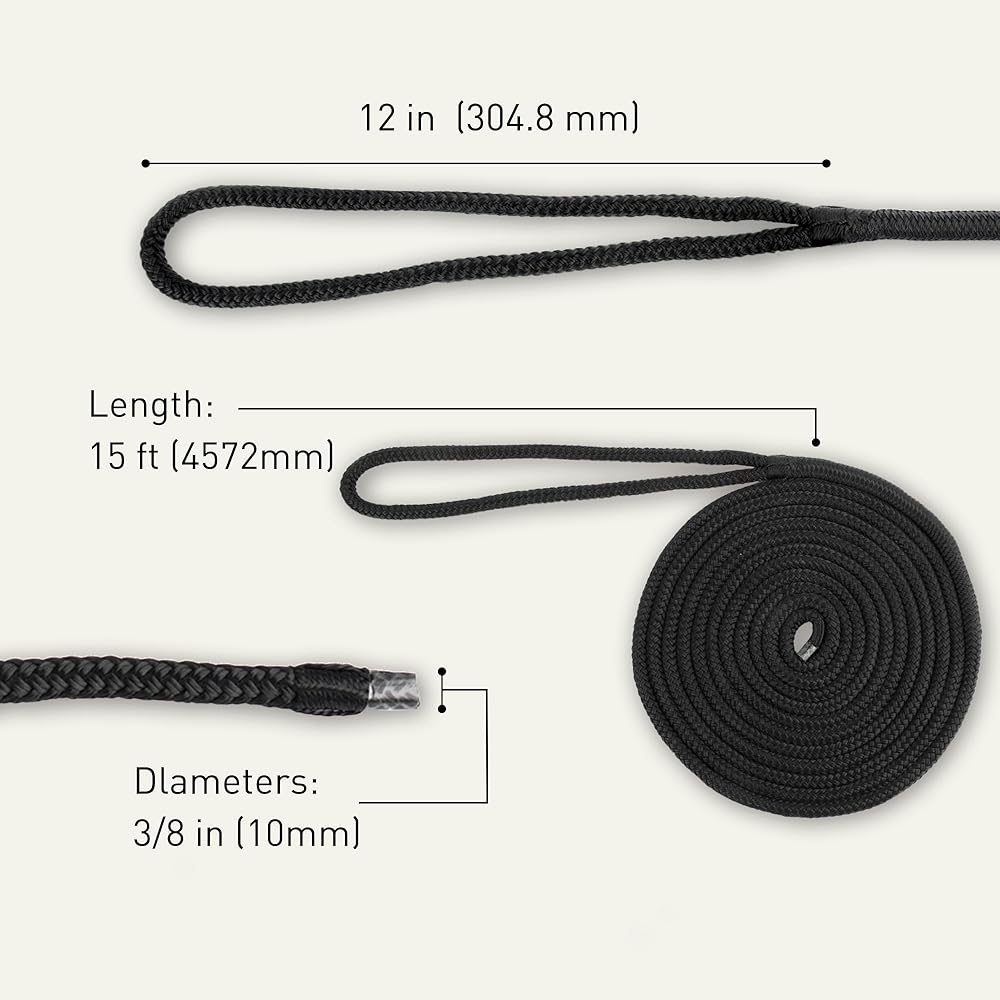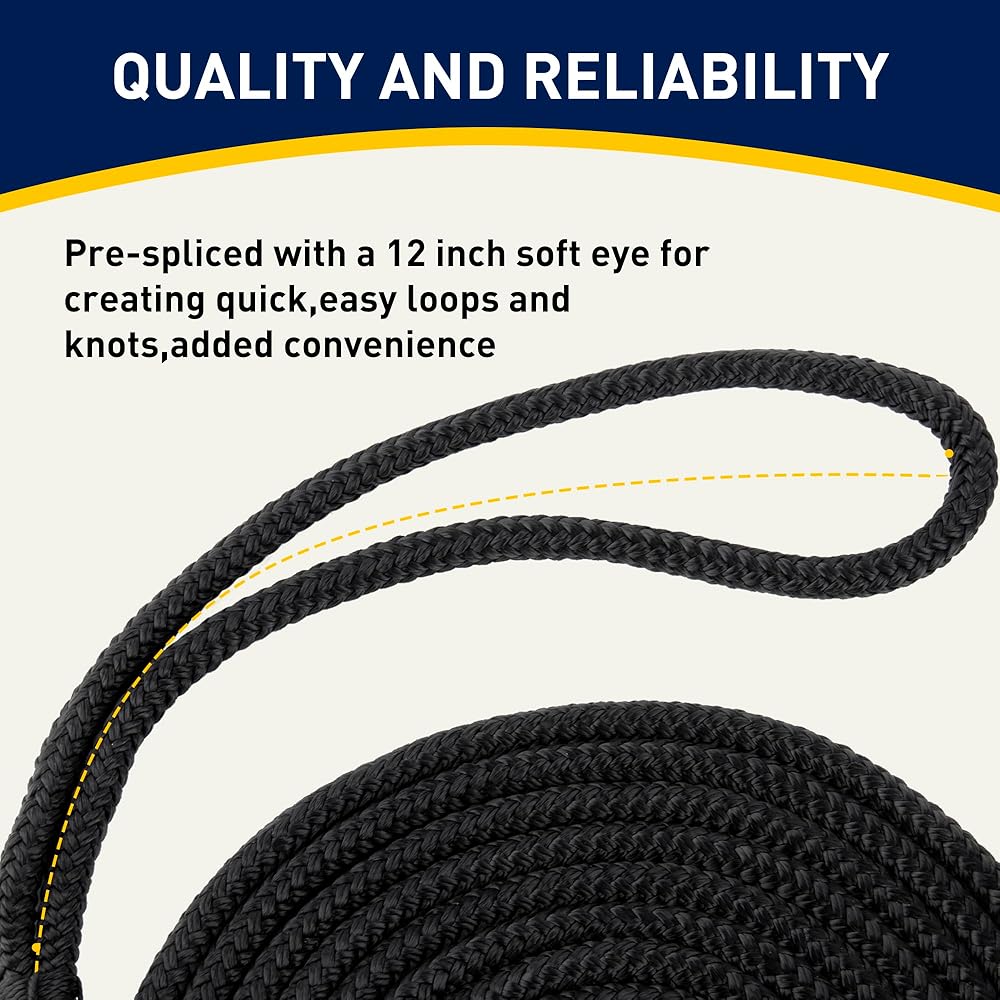 【High-Density Toughness & 12" Eyelet】Boat ropes for docking with loop, 3/8" × 15 feet size with a high-density structure, no stretching or loose knots under heavy loads. The pre-made 12" soft eyelet facilitates easy operation and knotting. Provides stable load-bearing for fishing boats during sea operations and yachts for long-term mooring
