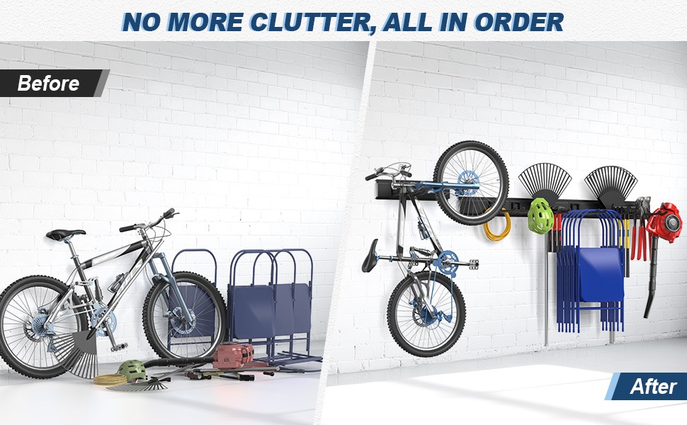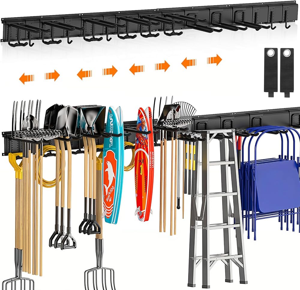 Adjustable Garage Storage System: Equipped with 96 inch track and 12 tool hooks, the track of tool organizer can be segmented, combined, or extended. Non-slip rubber pads on hooks prevent tools from sliding or scratching, ensuring long-lasting durability. All garage hooks adjust effortlessly to any track position and can be freely repositioned to fit storage needs, keeping tools and items organized neatly.