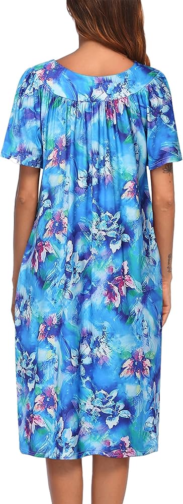 【Design】1. Two Side Pockets: deep enough to hold your phone, keys 2. No Buttons, Snaps or Zippers: easy to slip on and off 3. Flattering V-Neck and Printed Floral house dress makes you become more charming&attractive. 4. Pleated Design on the Front and Back makes the mumu dress more elegant