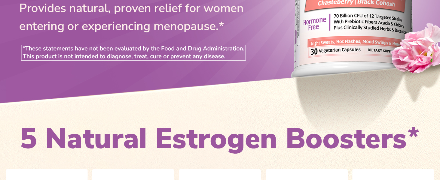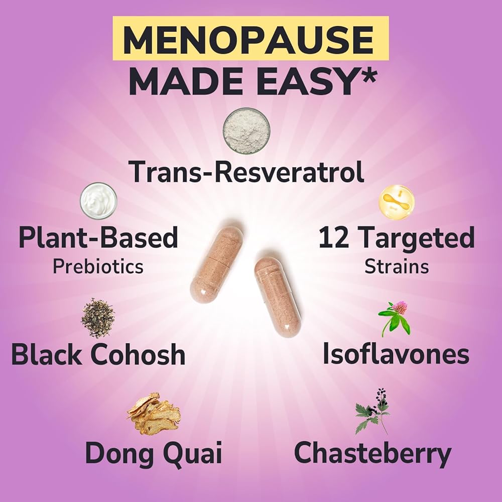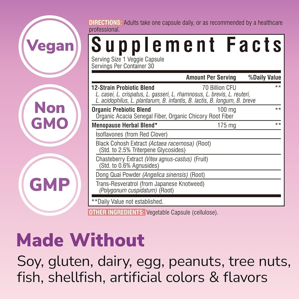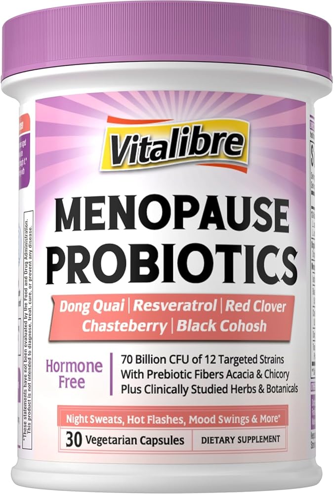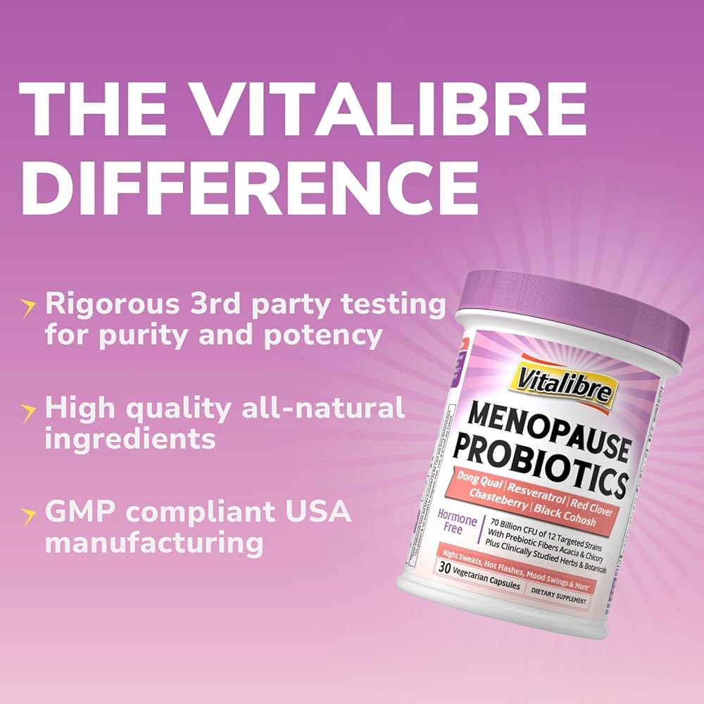 Vitalibre Menopause Probiotics for Women 70 Billion CFU, 12 Targeted Strains, Organic Prebiotics, Black Cohosh Resveratrol Red Clover Chasteberry Dong Quai, Hot Flash Night Sweat+, No Estrogen, 30 Ct