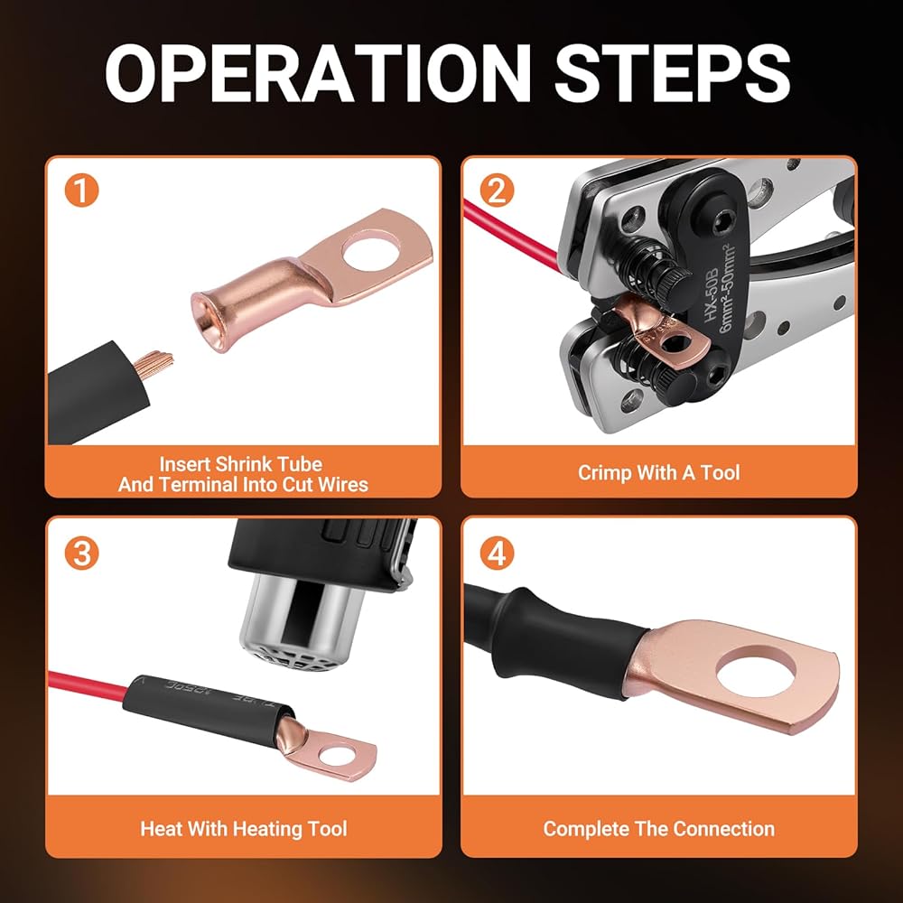 🧰Widely used:Ring terminals are used in conjunction with matching shrink tubing to provide a reliable electrical connection solution. Battery lugs are widely used in: power distribution boxes, marine power systems, golf carts, automotive wiring harnesses, motorcycle circuits, solar panel arrays, home electrical remodeling, DIY wire connection projects, and various other outdoor application scenarios.