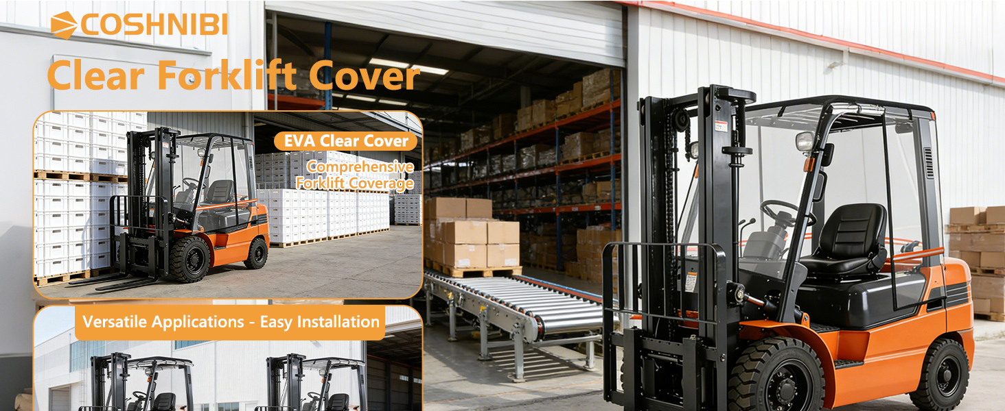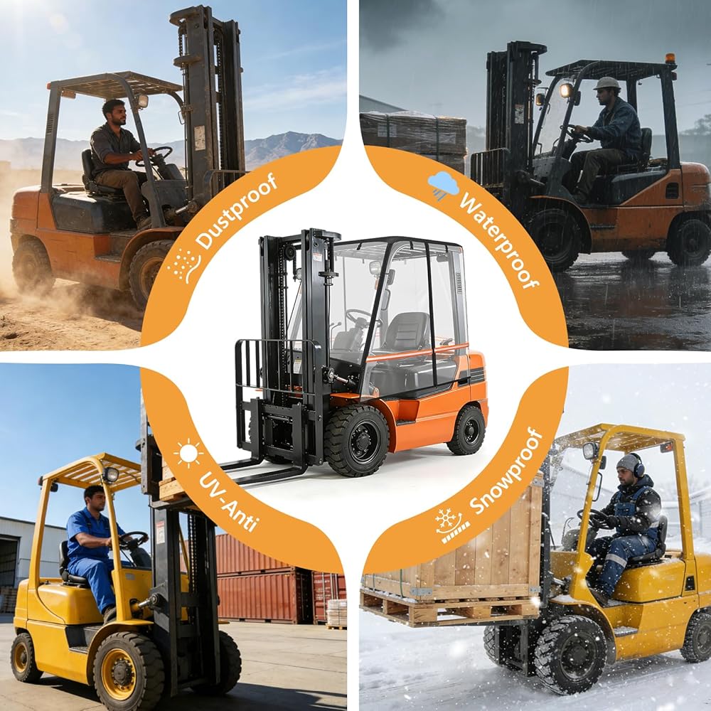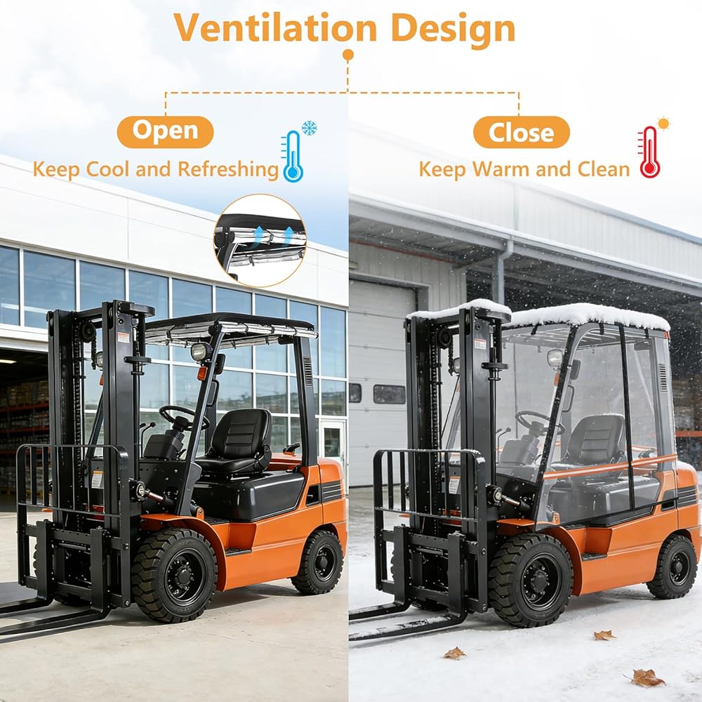 【Special Design】: Forklift cover features a roll-up design for easy folding; durable double-sided zippers on both sides enable full enclosure inside and outside the cab; hook-and-loop fasteners ensure the cover remains securely centered and stable during operation.