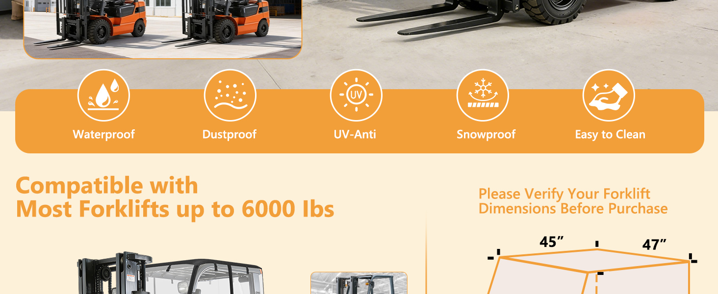 【Universal Fit】: The forklift cover measures 57'‘L x 47''W x 52''H and fits forklifts with a 6,000-pound capacity. Please verify your forklift's dimensions before purchasing to ensure the best fit.