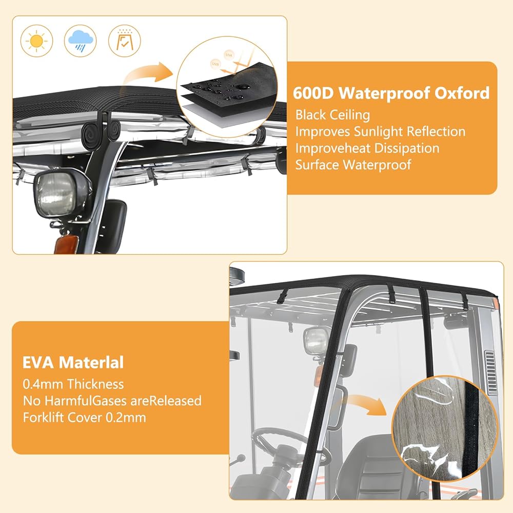 【Premium Materials】: The forklift cover features a 600D waterproof Oxford fabric top with a silver-coated inner layer. The body is constructed from durable, scratch-resistant waterproof transparent EVA material. Effectively reduces exposure to rain, dust, and UV rays.