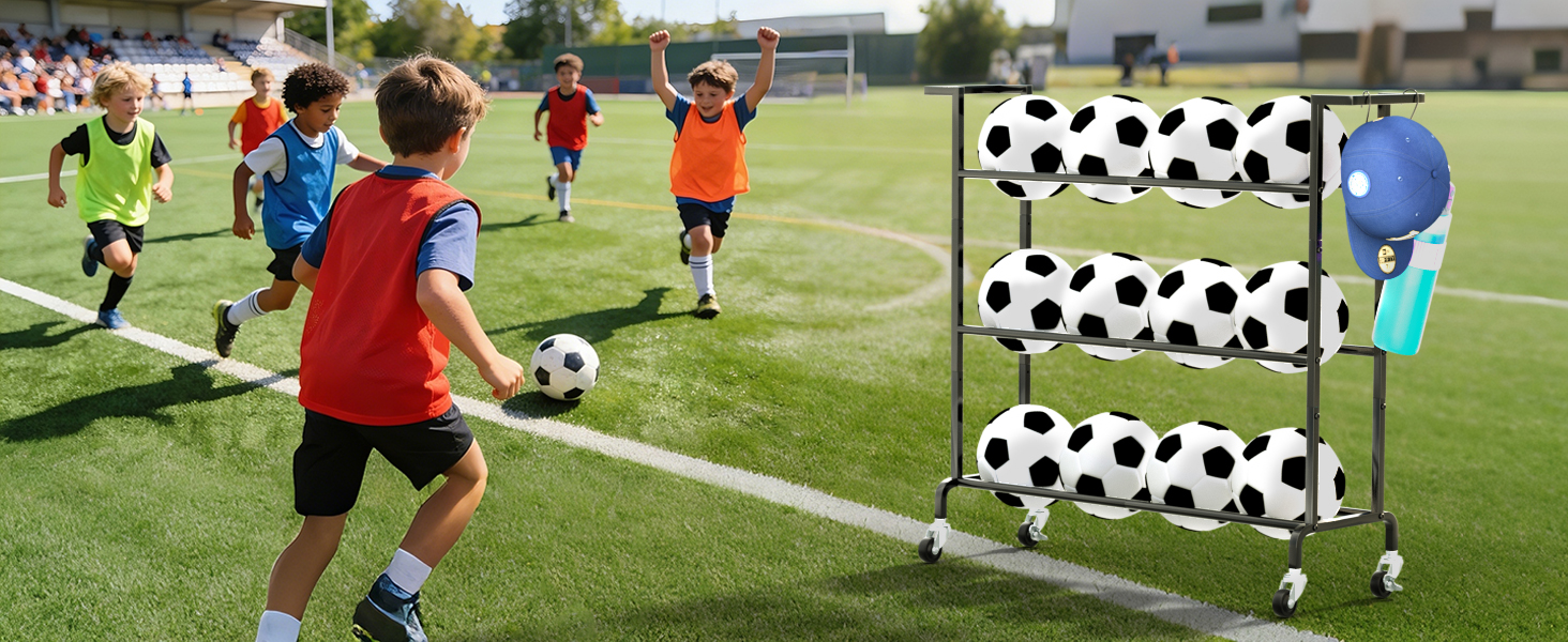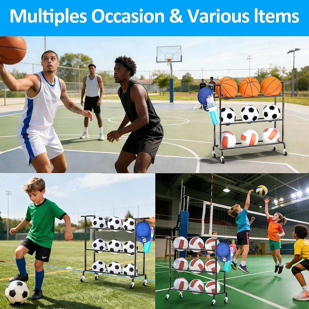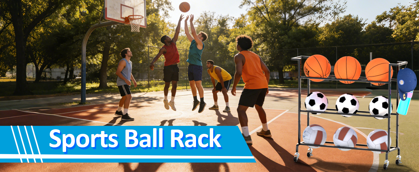 【Multi-Scene Use】This basketball racks for balls are suitable for multiple scenarios such as garages, homes, schools, training grounds, and sports fields. Easily store your basketballs, soccer balls, and volleyballs.