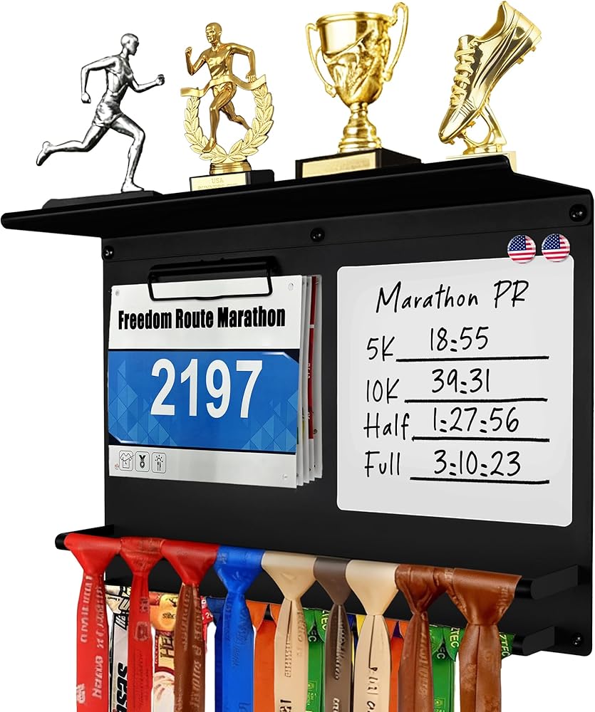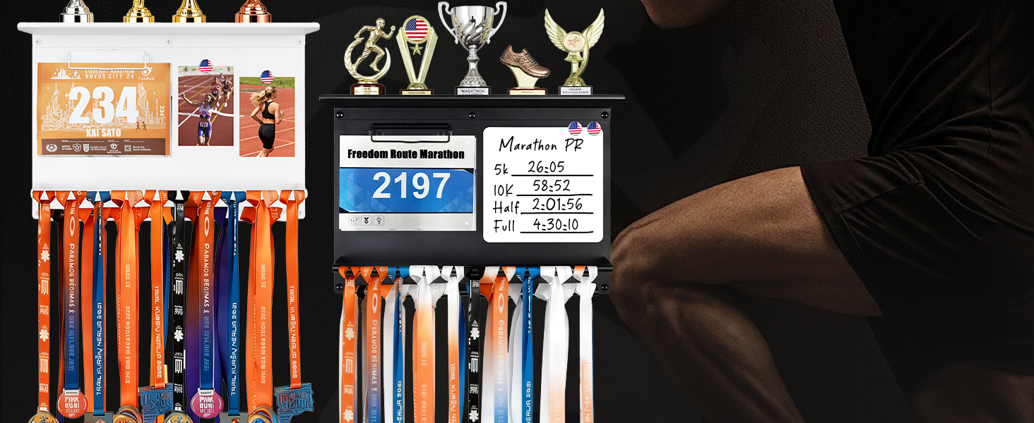 Showcase Your Running Story: Showcase your hard earned medals, favorite race bibs, and treasured trophies all in one place. This multifunctional display is more than a medal hanger; it is a daily source of pride and motivation for your running journey.