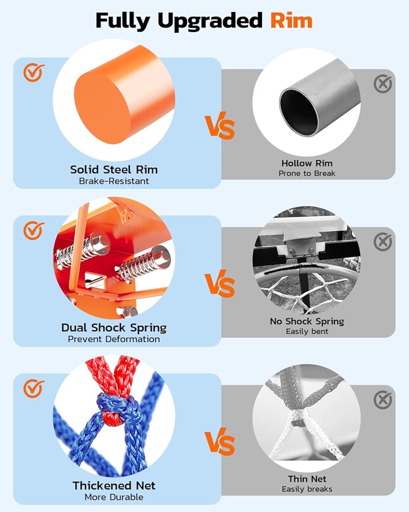 [Dual Spring Basketball Rim]:This replacement basketball rim is equipped with two springs that effectively absorb the impact when the ball hits the hoop. Over time, they also provide strong support from below, preventing downward bending or deformation for long-lasting durability
