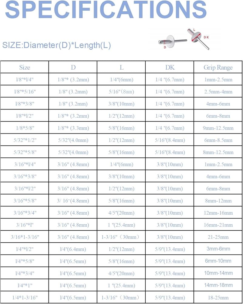 The Rivet Size is Diameter: 1/4 inch,Grip Range: 0.393-0.551inch