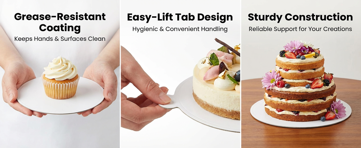 Sturdy & Easy to Lift – Crafted from thick, rigid cardboard that resists bending, providing reliable support for cakes and pastries. Features a convenient side tab for hygienic fingertip lifting without touching the dessert.