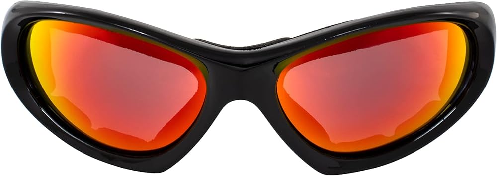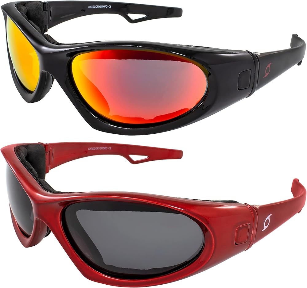 Master the wind and water in more ways than one when you wear a pair of our hard-working Hurricane Category 5 Jet & Water Ski Sports Interchangeable Sunglasses to Goggles Hybrid. This set of 2 features 1 pair of black frames with red mirror lenses and 1 pair of red frames with smoke polarized lenses. Enjoy the flexibility of wearing these shades as regular sunglasses or converting them to goggles for an extra-secure fit when you're out on the water or on the road. Simply detach the easy-to-remove arms of the CAT5 and replace them with the optional elastic strap that comes with your purchase. Boasting shatterproof polycarbonate scratch-resistant lenses, the CAT5 provides 100% UV400 protection from the sun while anti-fog coating ensures clear visibility in all conditions. Vented EVA foam padding shields eyes from wind and water and other debris while also providing extra comfort for all-day wear. The Hurricane CAT5 is perfect for all kinds of activities, including motorcycle riding, cycling, mountain biking, running, fishing, skiing, jet skiing, water skiing, hiking and more. We are also pretty pleased that the Category 5 floats! So if you happen to drop them in the water, you don't have to worry about them sinking to the bottom. The package comes complete with a microfiber pouch for cleaning and safe storage.