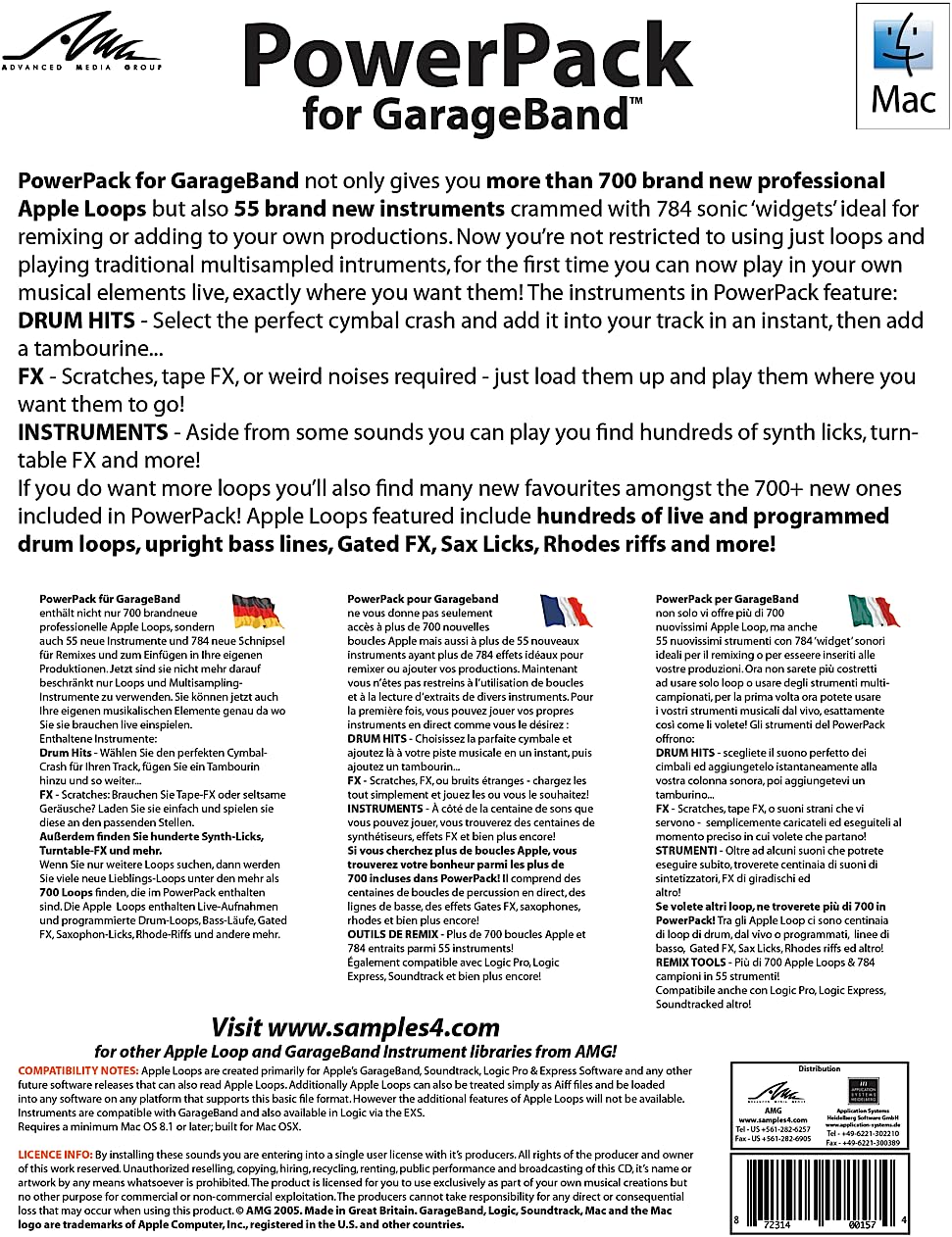 PowerPack for GarageBand not only gives you more than 700 brand new professional Apple Loops but also 55 brand new instruments crammed with 784 sonic 'widgets' ideal for remixing or adding to your own productions. Now you're not restricted to using just loops and playing traditional multisampled intruments, for the first time you can now play in your own musical elements live, exactly where you want them!
