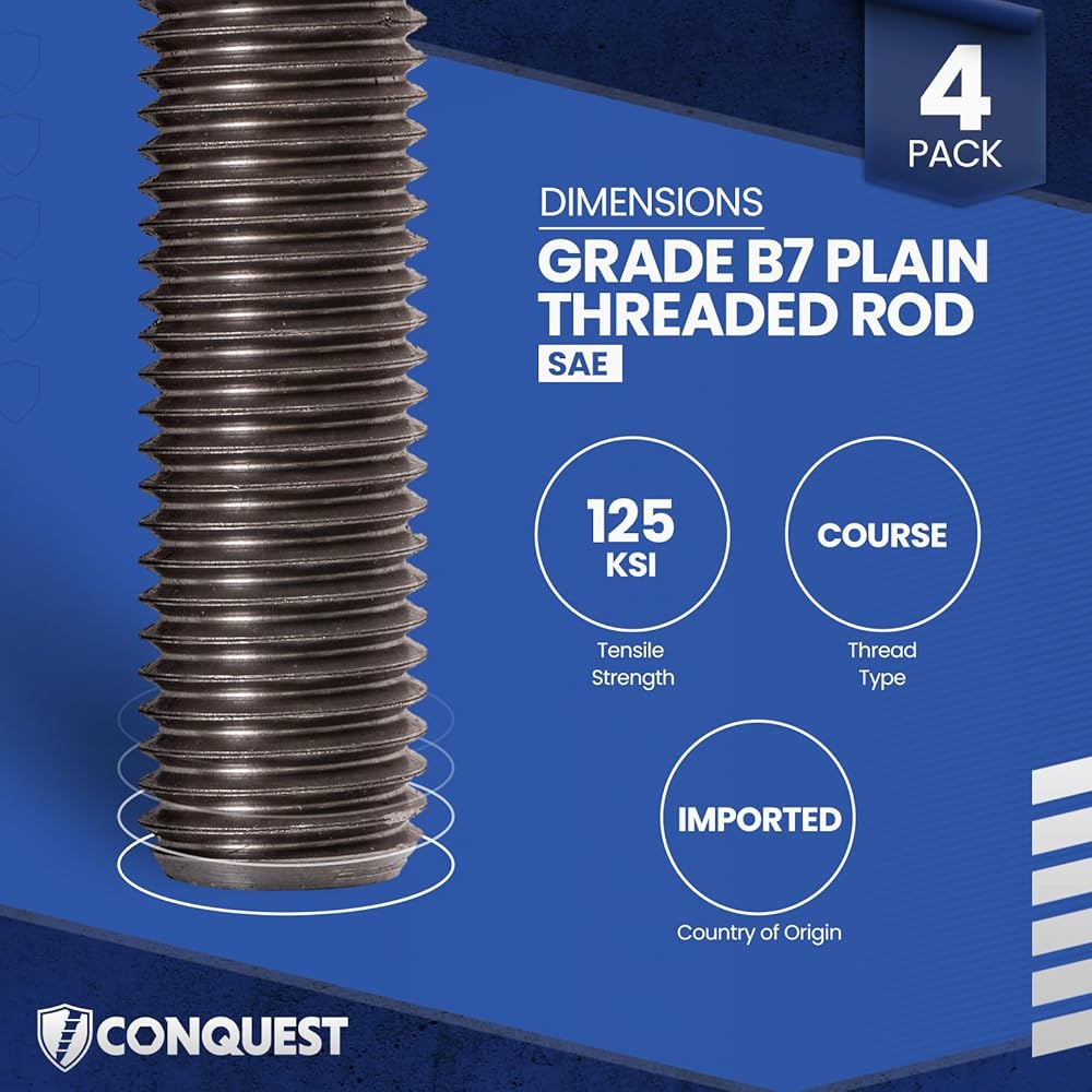 Conquest Fasteners Grade B7 Coarse Fully Threaded Rod, Plain Finish, 1" -8 Thread Size, 18" Length, Right Hand Threads (4 Pack)