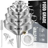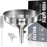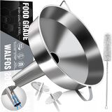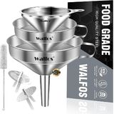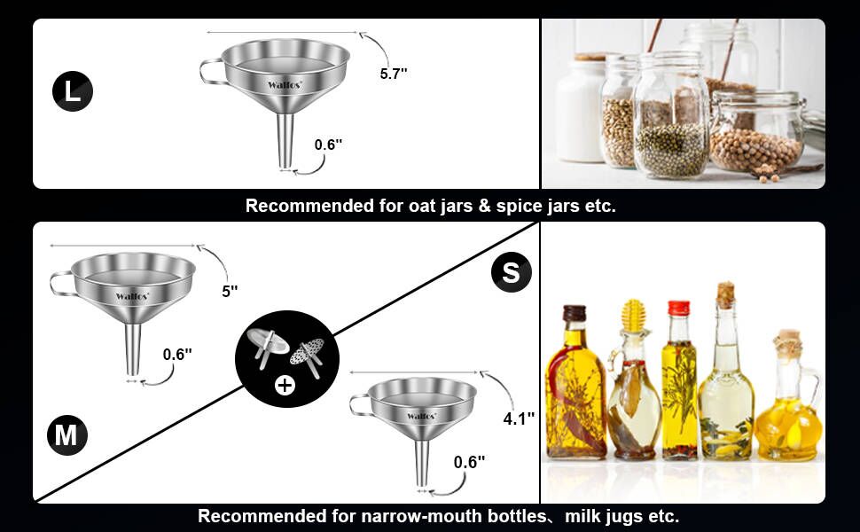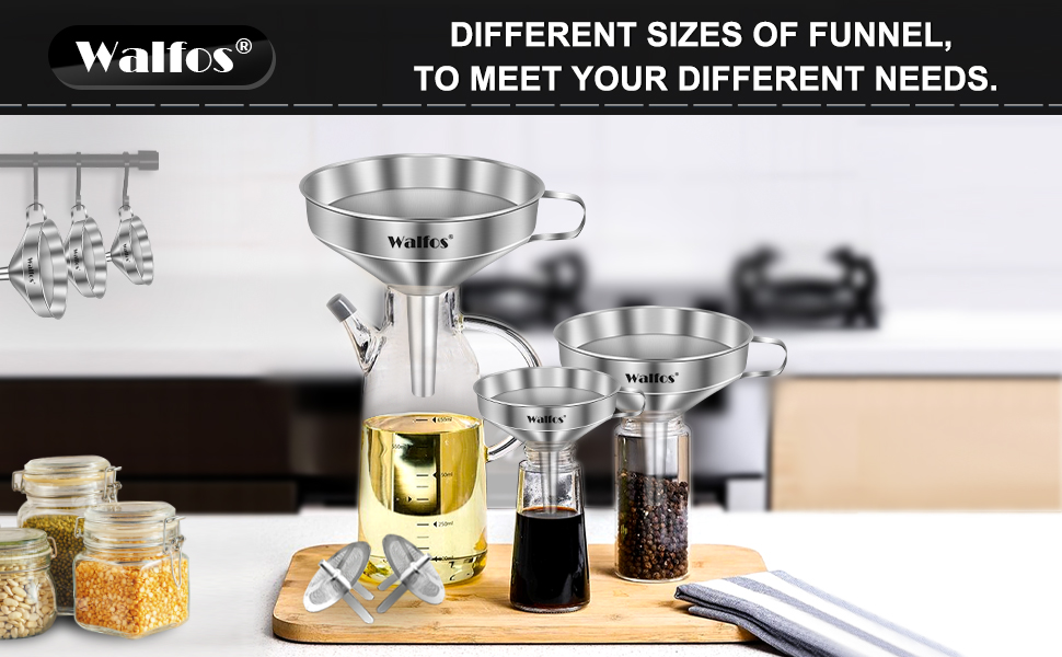 EASY TO USE & CLEAN - Stainless steel funnel has a side handle to conveniently hold the funnel over a jar, pot or pan. With convenient loop on the side, you can put it in kitchen cabinets, hang in garages, stored in utility rooms or anywhere you can put it. Easy to clean by simply washing with soapy water after use. It is also dishwasher safe(WALFOS RECOMMEND:Please clean and dry in time after use)