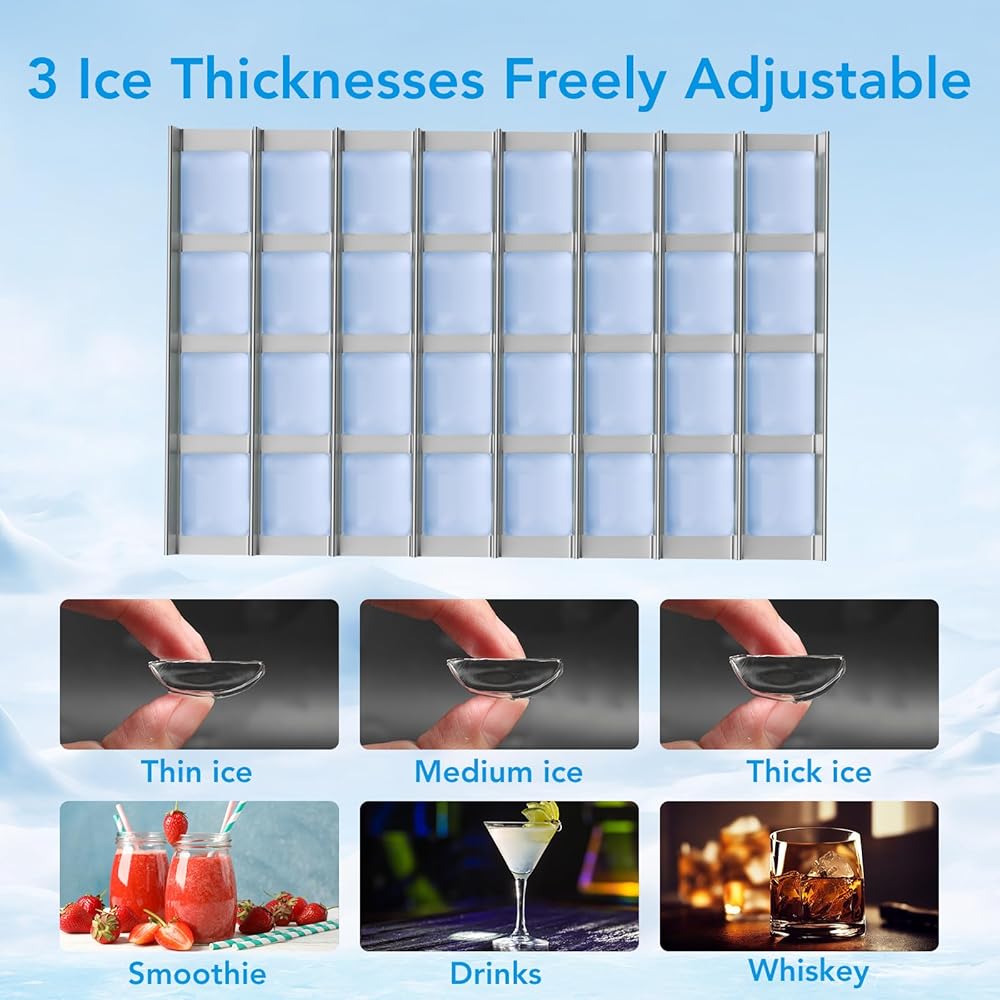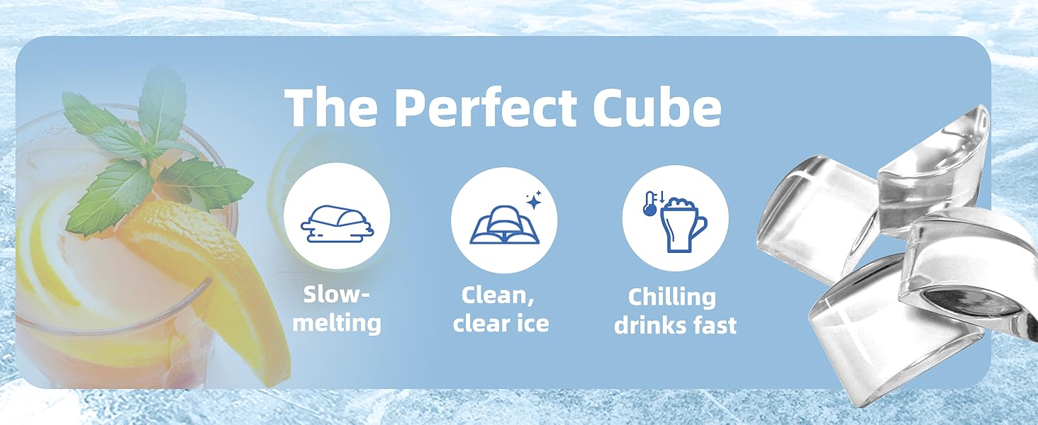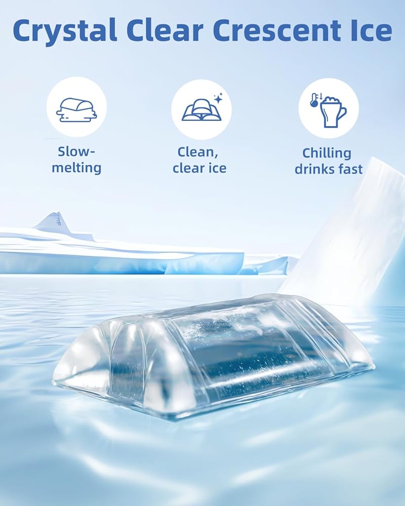 Slow-Melting Crescent Ice Cubes: The crescent-shaped ice cubes fit snugly against cups, increasing contact with drinks for faster cooling. Their larger surface area ensures slower melting, keeping beverages cold longer. Dual-sided ice production makes 32 cubes per batch, with three adjustable thickness options.
