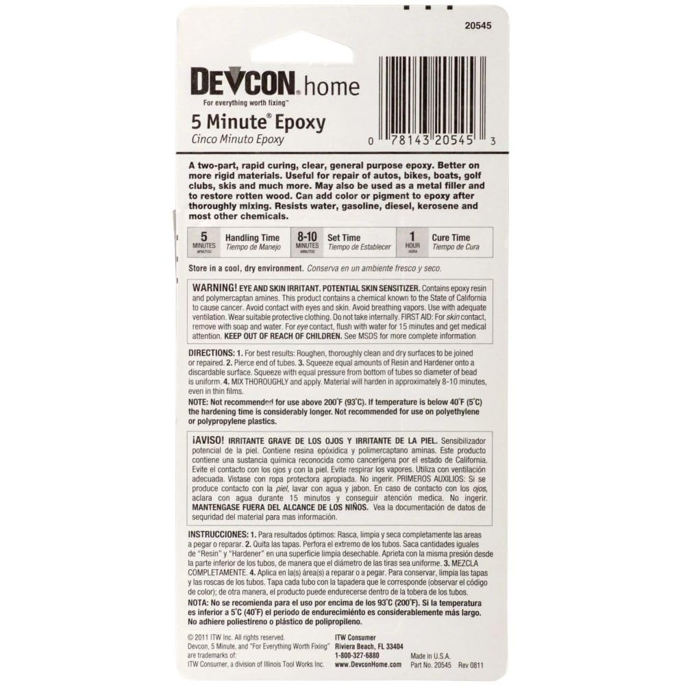 Devcon epoxy adhesives cure and join things together by a chemical reaction between the resin and the hardener. This reaction results in high strength bonds, in 5 minutes.