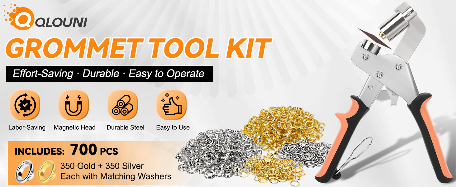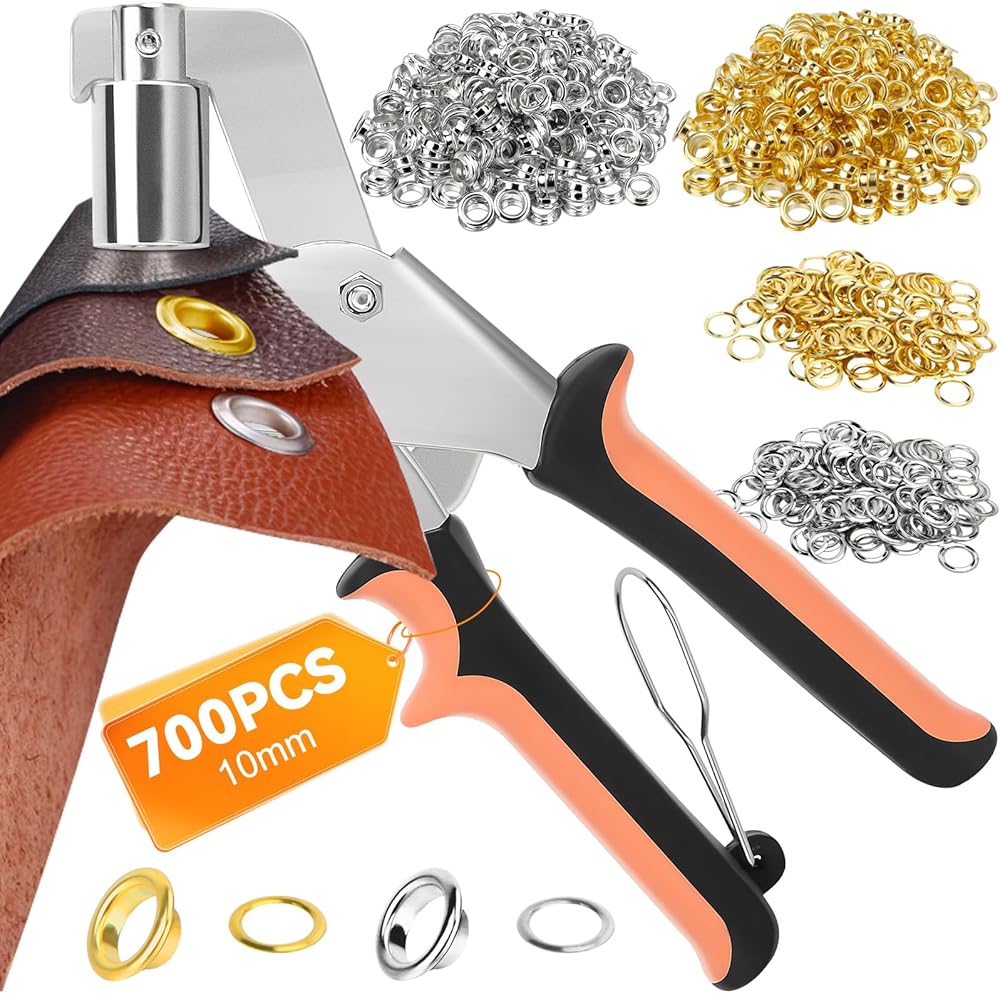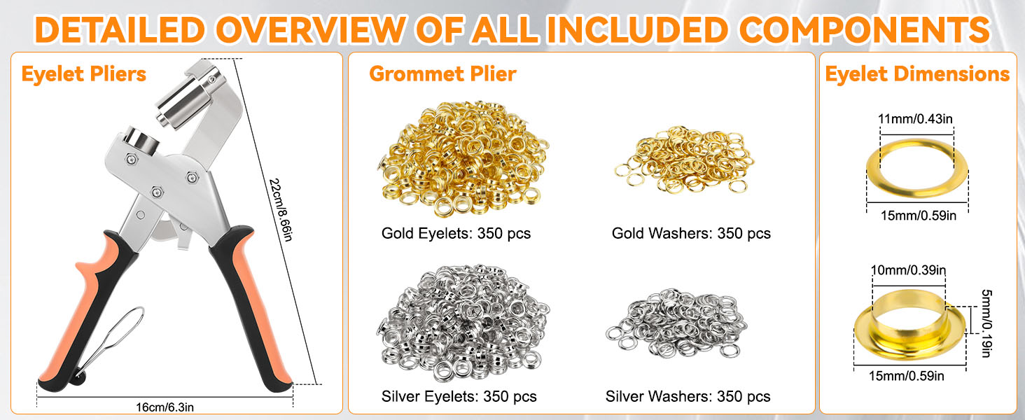700-SET VALUE PACK (EYELET + WASHER) Includes 350 gold + 350 silver grommet sets (each set = eyelet + matching washer) plus a sturdy setting plier—ready for DIY repairs, crafts, and replacements.