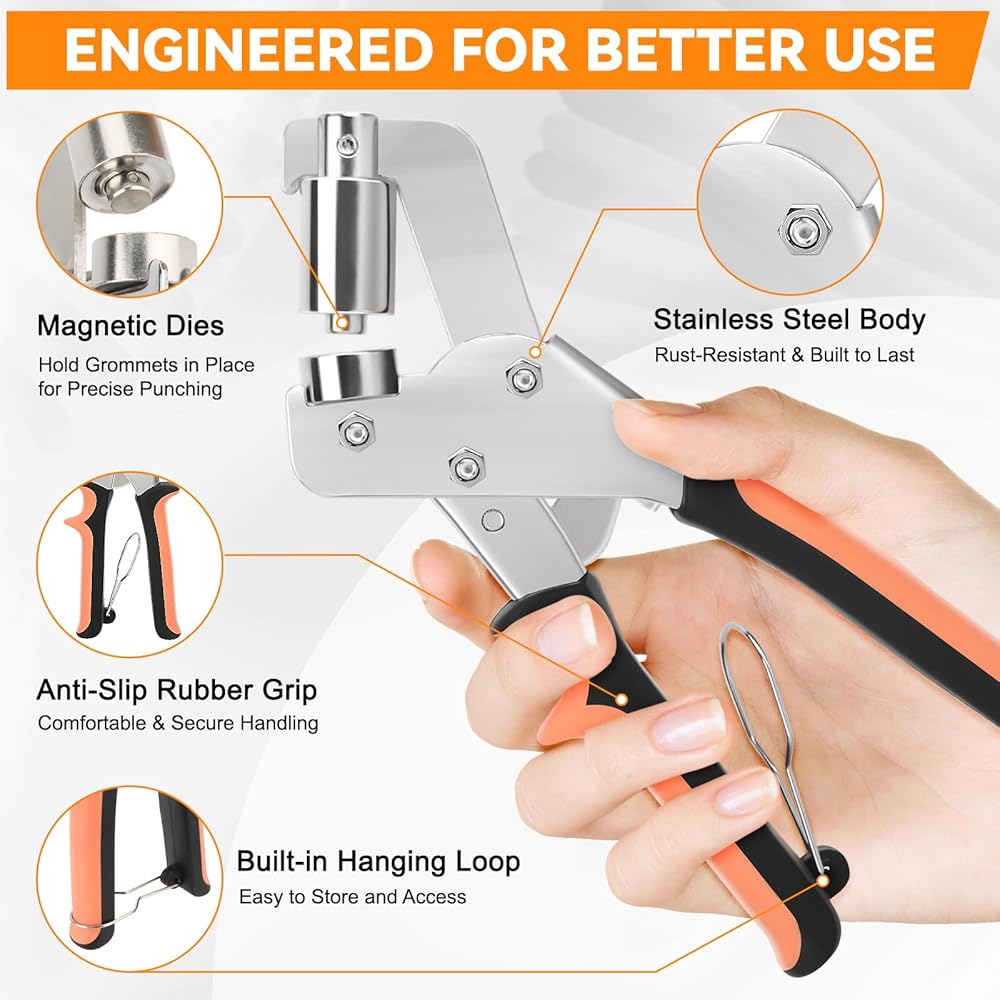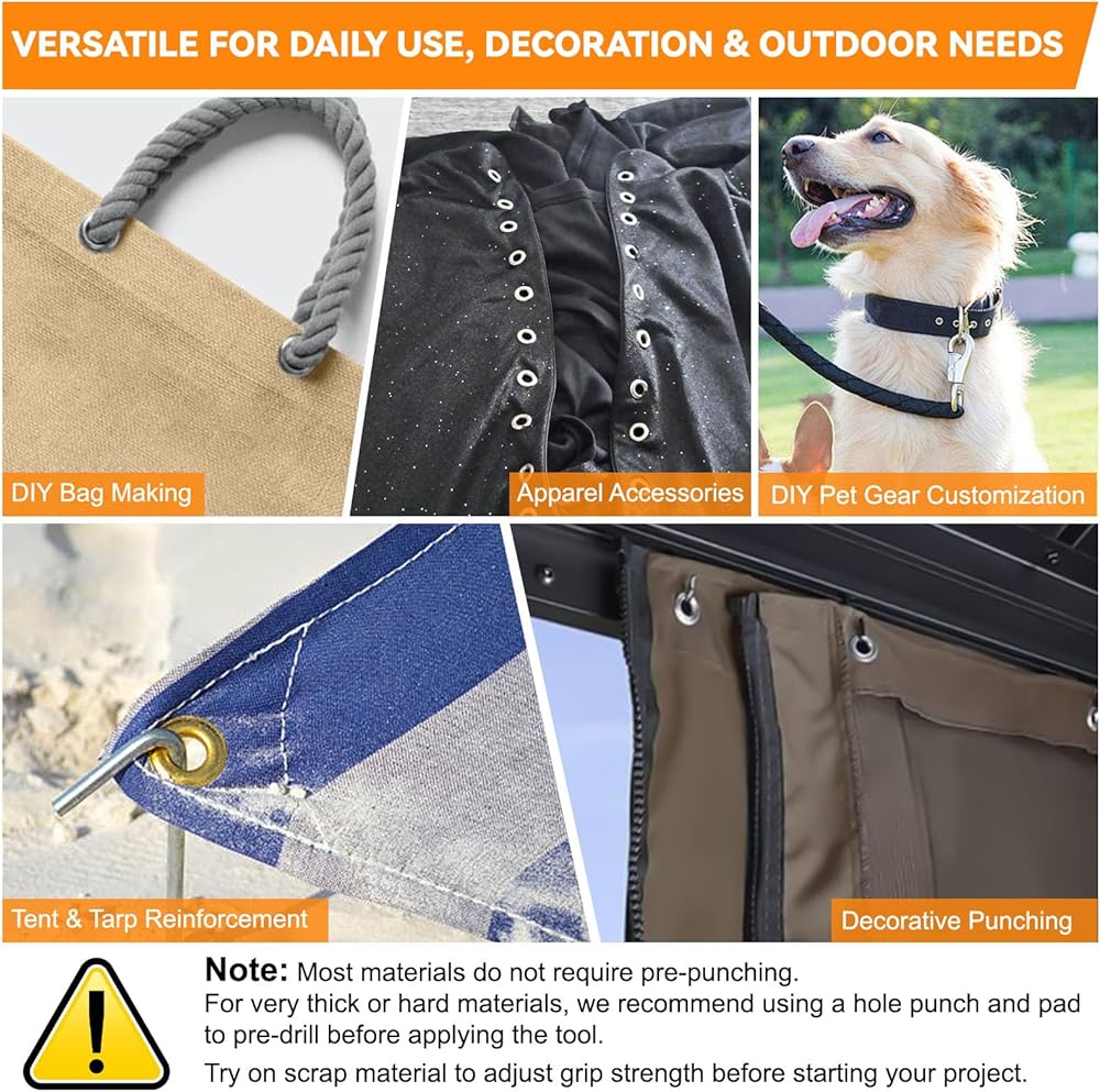 WIDE DIY USE + PRO TIP FOR THICK MATERIALS Great for canvas, tarps, leather, fabric, PVC sheets and more—shade cloth, banners, tote bags, belts, pet gear. For thick/tough layers, pre-punch a hole first for the cleanest set.