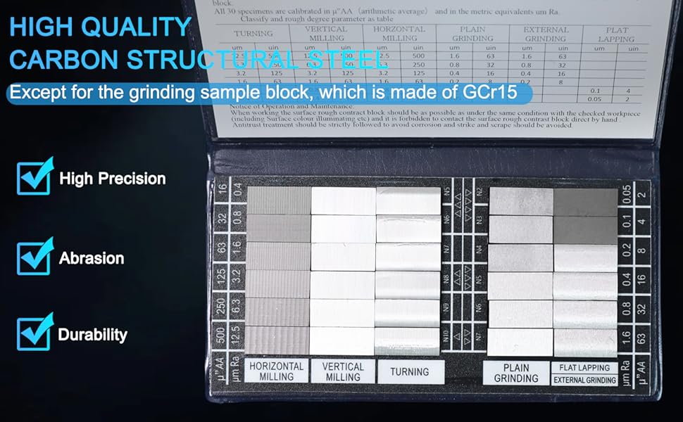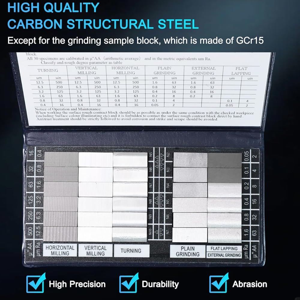 【Intuitive Tool for Pros & Students Alike】 Designed for clarity and ease, this Portable Roughness Comparator Set is the ultimate Visual Surface Texture Comparator. Blocks are permanently marked with their Ra value and arranged in order, making Roughness Comparison Samples easy to identify. It's an indispensable Engineering Teaching Roughness Comparator and a quick-reference Machinist Surface Roughness Comparison Kit for the workshop bench.