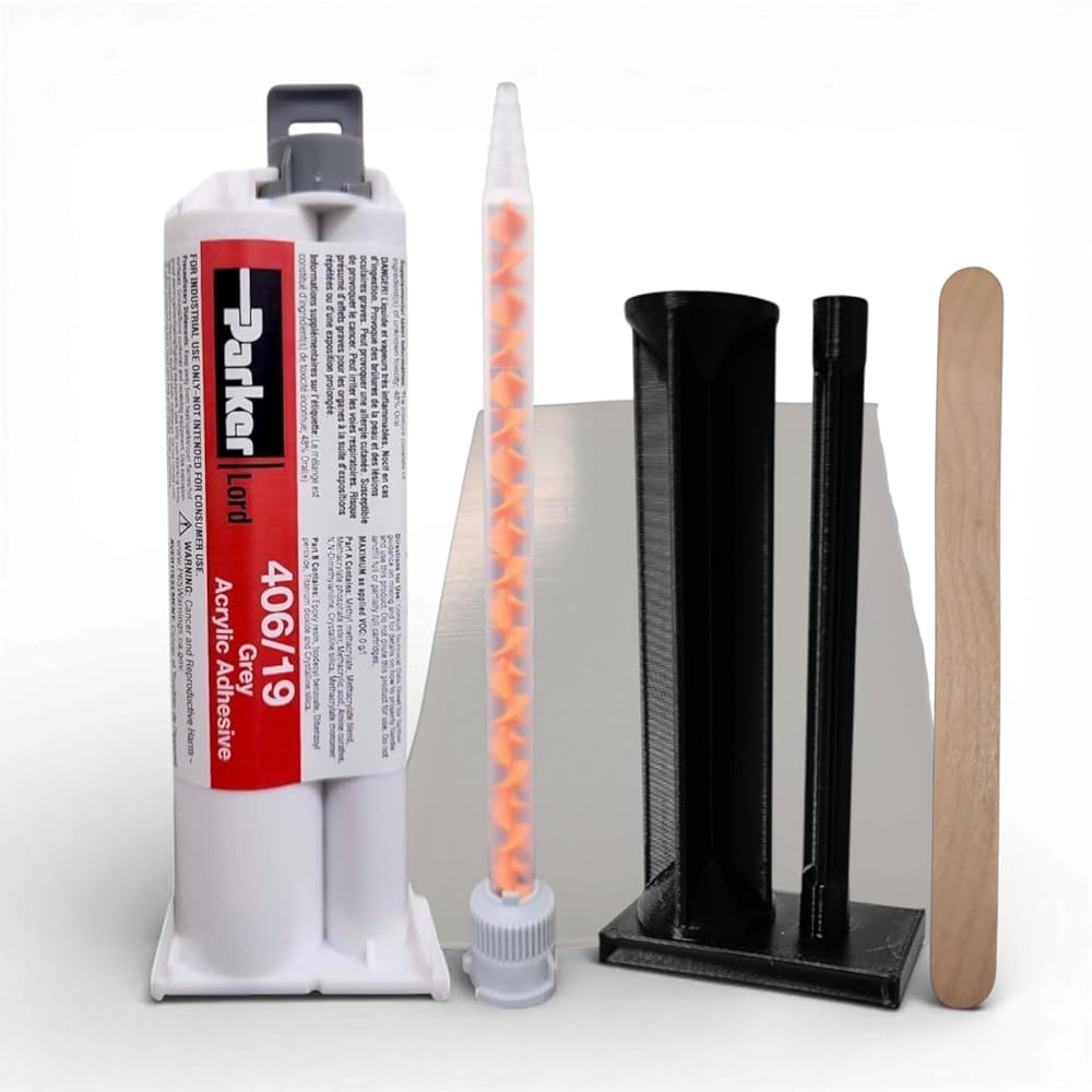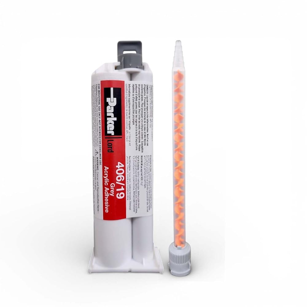LORD 406/19 is a high-performance acrylic adhesive designed to replace traditional joining methods like welding and riveting. This fast-setting adhesive offers a 6-10 minute working time with handling strength achieved in 12-17 minutes. Its non-sag formula stays in place on vertical and overhead surfaces, making it versatile for various applications. The adhesive bonds effectively to unprepared metals and engineered thermoplastics, including XENOY, polycarbonate, ABS, and acrylics. With impressive temperature resistance from -40°F to +300°F, it maintains strength in demanding conditions. The glass microbead-infused formula ensures controlled minimum bondline width. When cured, this tan-colored adhesive demonstrates excellent tensile strength of 4,650 psi and 30% elongation. It effectively resists moisture, salt spray, weathering, and various chemicals including dilute acids, alkalis, solvents, oils, and greases. The 4:1 mix ratio by volume makes it practical for industrial applications where precise measurements are required.