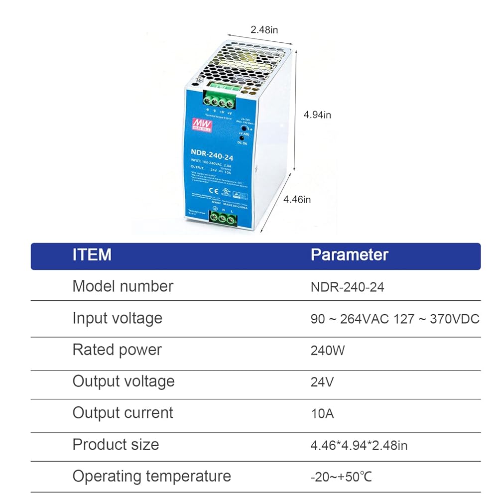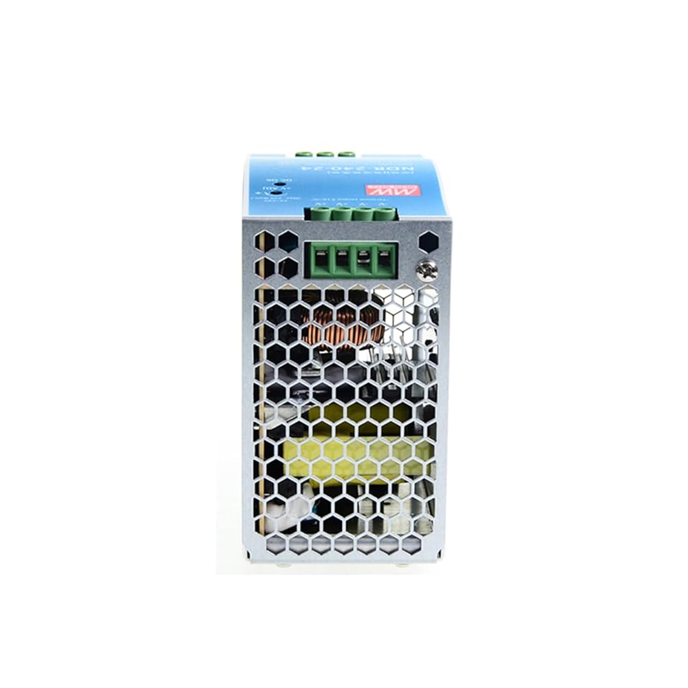 The NDR-240-24 is a 24VDC output voltage, 10A output current, 240W rated power single output DIN Rail power supply with universal AC input and full range, making it suitable for a wide variety of industrial applications worldwide. It utilizes a highly efficient circuit design to effectively reduce power loss and heat generation, improving power efficiency and stability. This power supply offers short circuit, overload, over voltage, and over temperature protections, and cools by free air convection for long-term, reliable operation. The NDR-240-24 can be installed on DIN rail TS-35/7.5 or 15, featuring a slim design with only 63mm width, saving installation space. It has built-in active power factor correction (PFC) function, complies with UL508, TUV BS EN/EN62368-1 safety certifications and is 100% full load burn-in tested for reliable performance, making it an ideal choice for various industrial applications, especially those requiring 24VDC power supply.