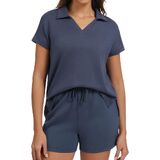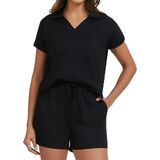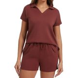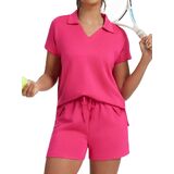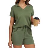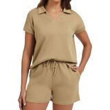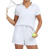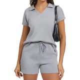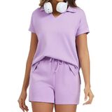 Stylish V-Neck Polo & High-Waisted Shorts Design:This casual outfits includes a trendy v-neck polo short-sleeve top (with a high-low hem and side slits) that balances fashion and unrestricted movement. The high-waisted drawstring shorts deliver a flattering, customized fit—cinching your waist neatly while providing secure support, making the outfit both chic and practical for summer wear.