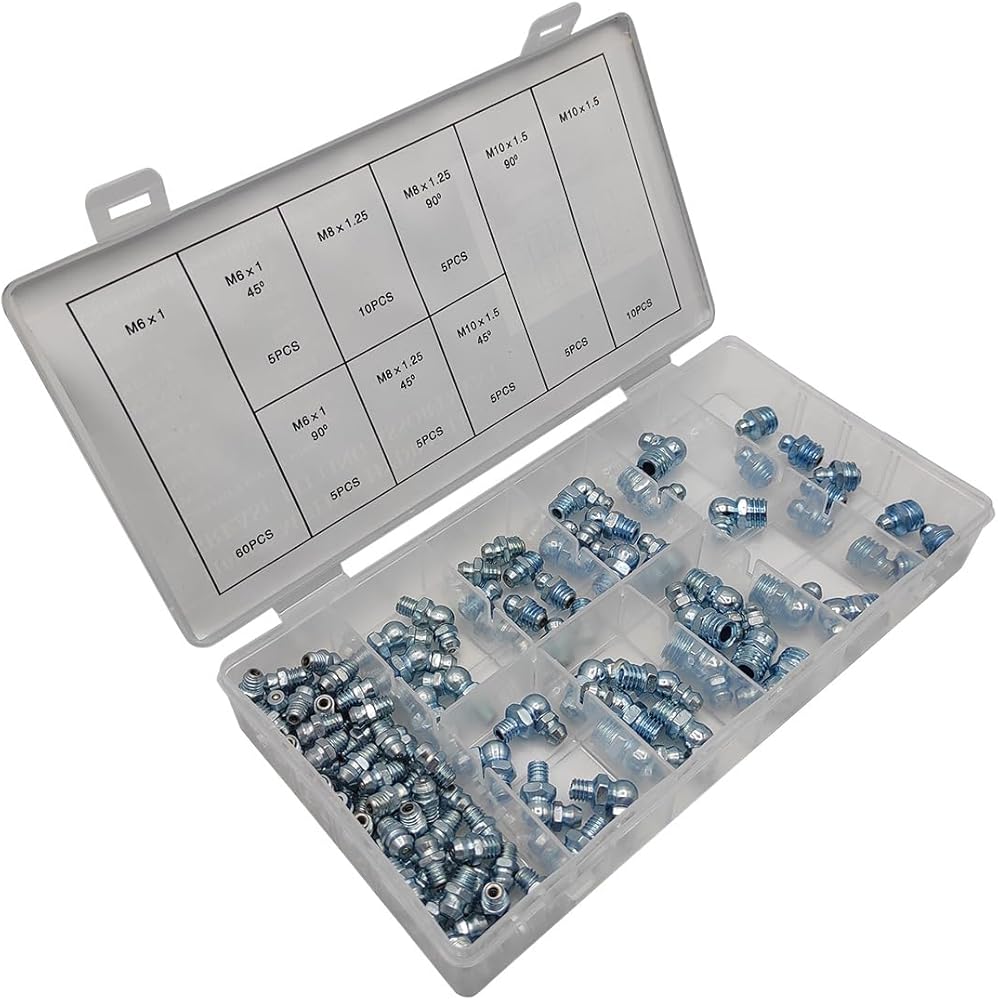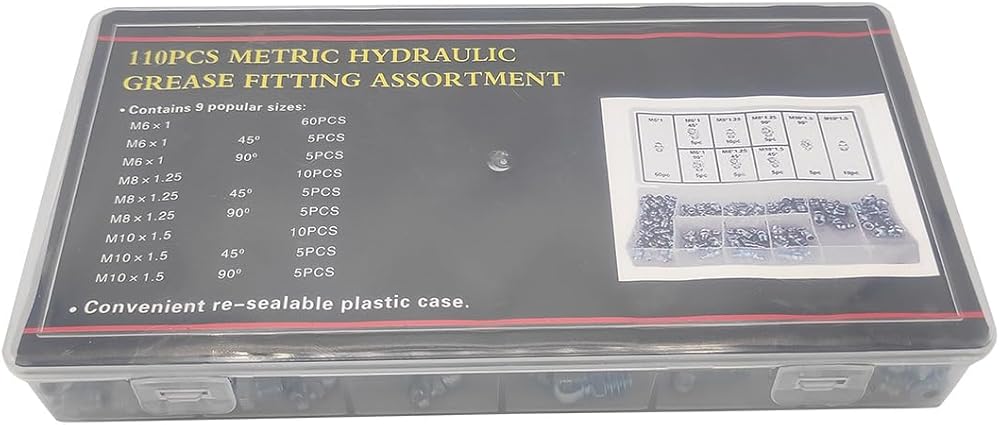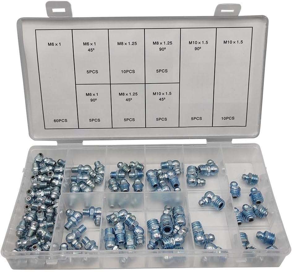 COMPREHENSIVE KIT: 110-piece grease fitting set includes M6, M8, and M10 size metric grease nipples in straight, 45°, and 90° angles