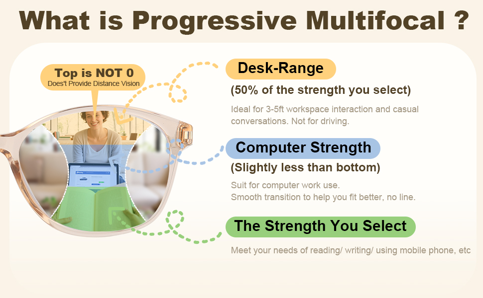Workspace Multifocus Readers: Designed for women who spend extended hours in front of screens or at desks or other 3-5 FEET range. The top section of the lens offers 50% magnification you select, ideal for casual conversations. The middle part is slightly reduced transition strength for computer or laptop tasks. The lower part provides the full magnification you choose for reading, writing, and detailed work. Perfect for multitaskers seeking seamless visual support throughout their day