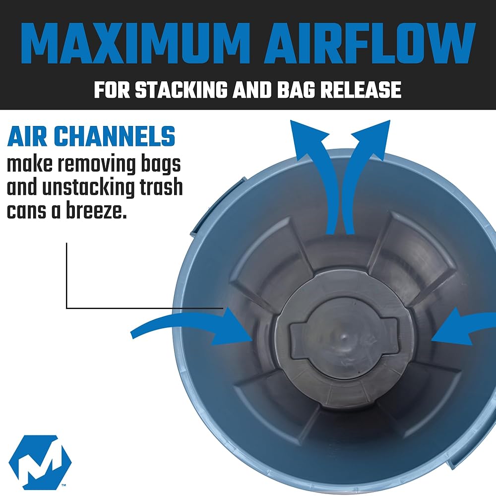 The MAGNUM trash is constructed with air channels along the sides to allow both trash bags and stacked trash cans to easily slide in and out without building air pressure and getting stuck. Like the handles of all the best trash cans, the Magnum commercial trash can also has slats in the handles for securing bags so they don't come loose and fall to the bottom. But unlike other major competitors' commercial trash cans, the Magnum trash can's handles are extremely low profile while still being ergonomic. They run very close to the top edge which allows our trash cans to stack while only adding 5 additional inches per trash can, saving lots of space when being stored or transported – all without compromising strength and quality. Our trash cans feature handles up top and grip handles on the bottom to make for easy lifting and dumping. Furthermore, the handle fits perfectly in the groove of the reinforced lid allowing you to hang the lid along the side of the trashcan, so you will never lose your lid while transporting your trash.