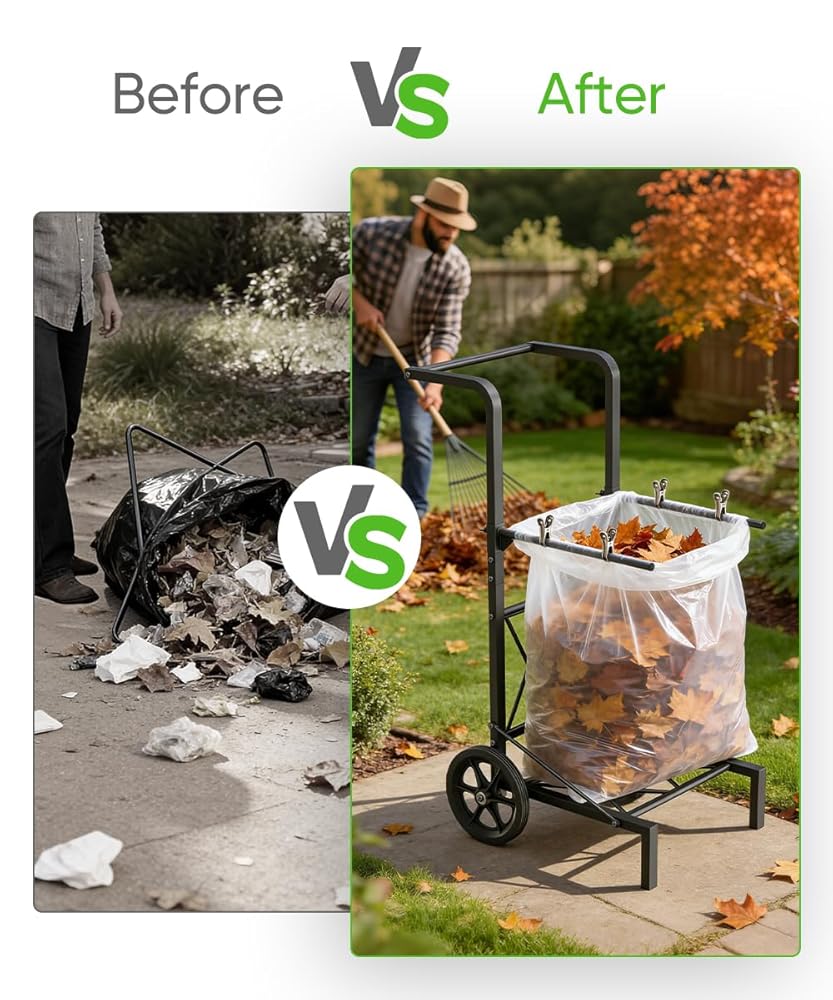 EFFORTLESS COLLECTION & DISPOSAL – Say goodbye to bending over or struggling with garbage bags. Simply place your bag into the lawn bag holder stand, fill it with leaves, grass clippings, or debris, then roll it directly to your disposal area. Turns tedious yard work into a simple, one-step process.