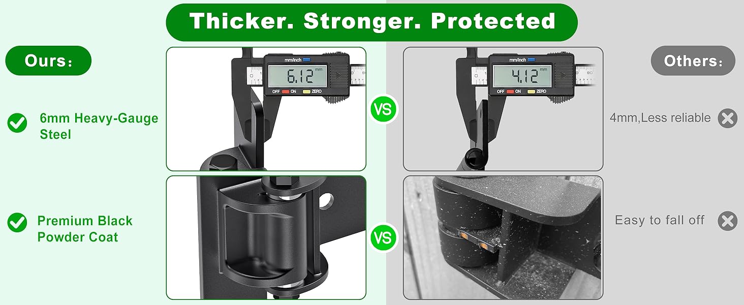 PREMIUM RUST RESISTANT FINISH: These heavy duty gate hinge feature a protective black powder-coated finish. Whether exposed to rain, snow, or extreme heat, this durable construction ensures your fence hardware remains strong and functional for years.