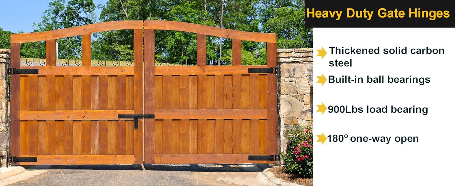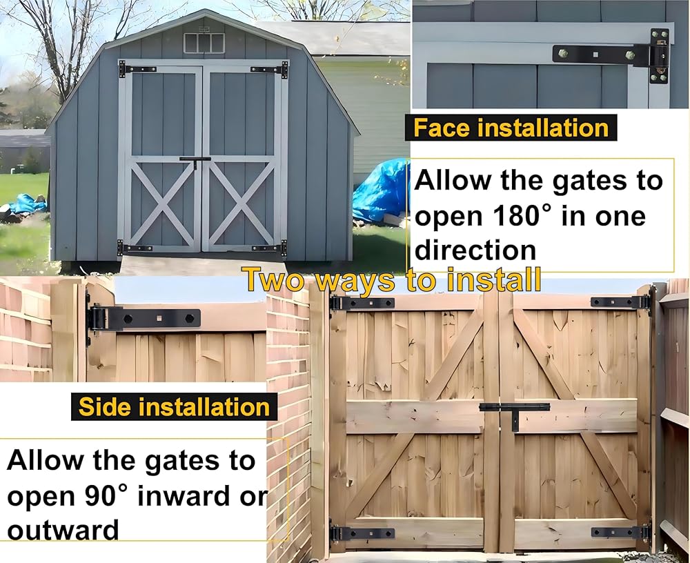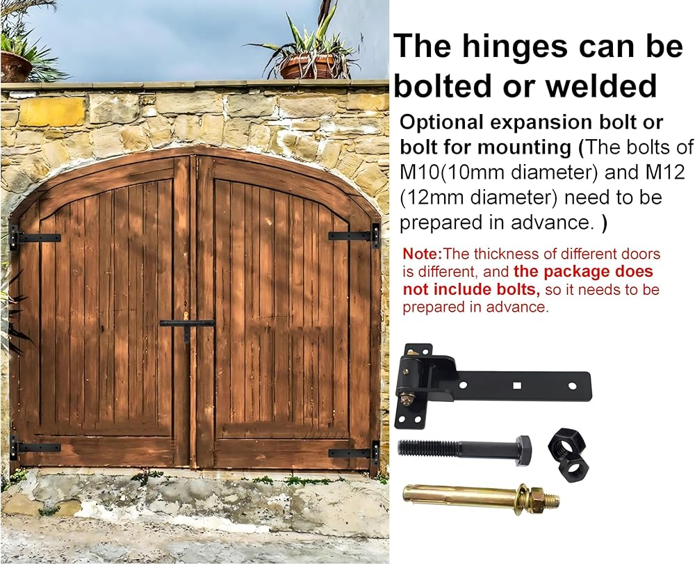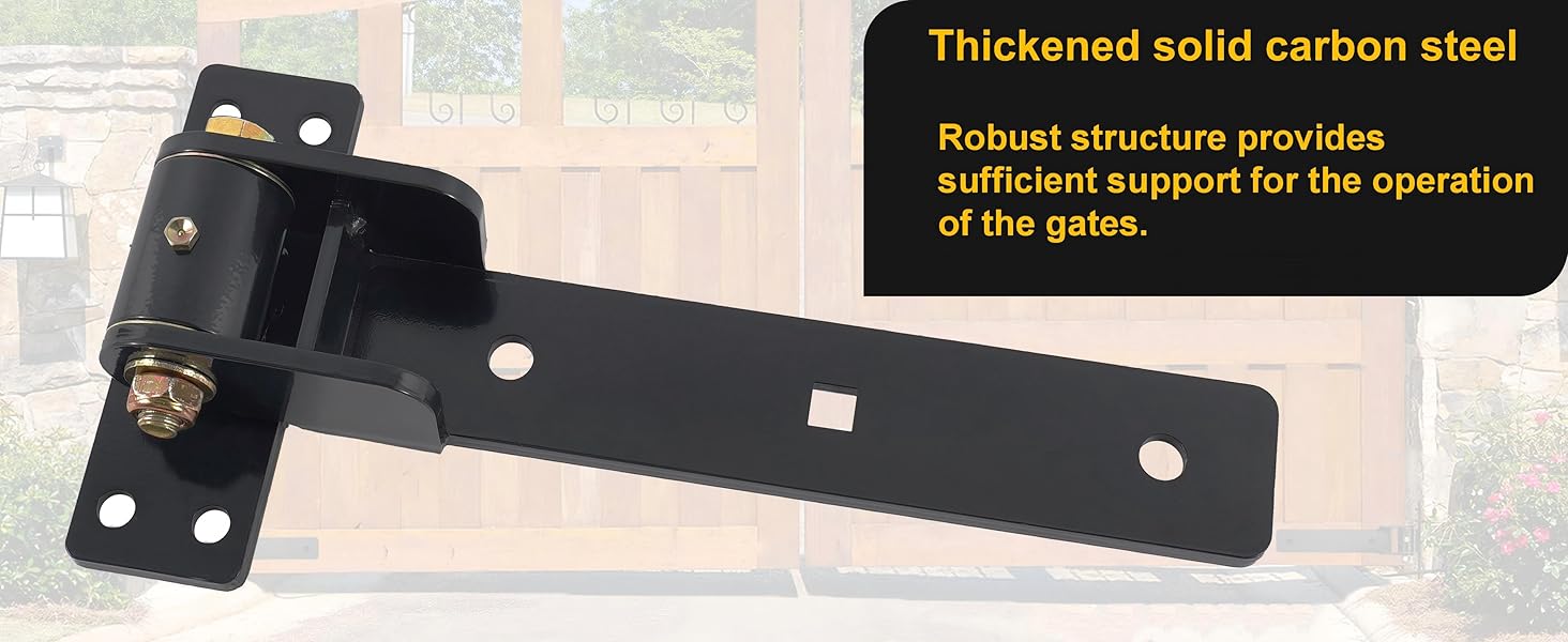WIDE APPLICATION FOR RESIDENTIAL & FARM USE Enhance the rustic charm and functionality of your property. These heavy-duty T-hinges are specifically designed for a variety of surfaces, including wooden gates, metal gates, wrought iron fences, and aluminum frames. Use them for garden gates, tool shed doors, garage doors, or warehouse entryways to add a touch of industrial character while ensuring maximum security and performance.
