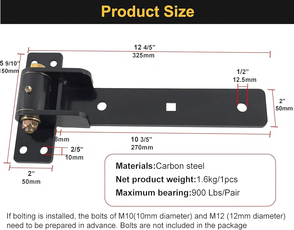 MASSIVE SUPPORT FOR HEAVY GATES (UP TO 900 LBS) Designed for demanding environments, these heavy-duty hinges provide a robust support system capable of holding up to 900 lbs per pair. With an extended 13-inch (325mm) strap, they distribute weight evenly across large structures, preventing sagging. Perfect for oversized farm gates, commercial fence entrances, and heavy wooden barn doors that require reliable, long-term support.