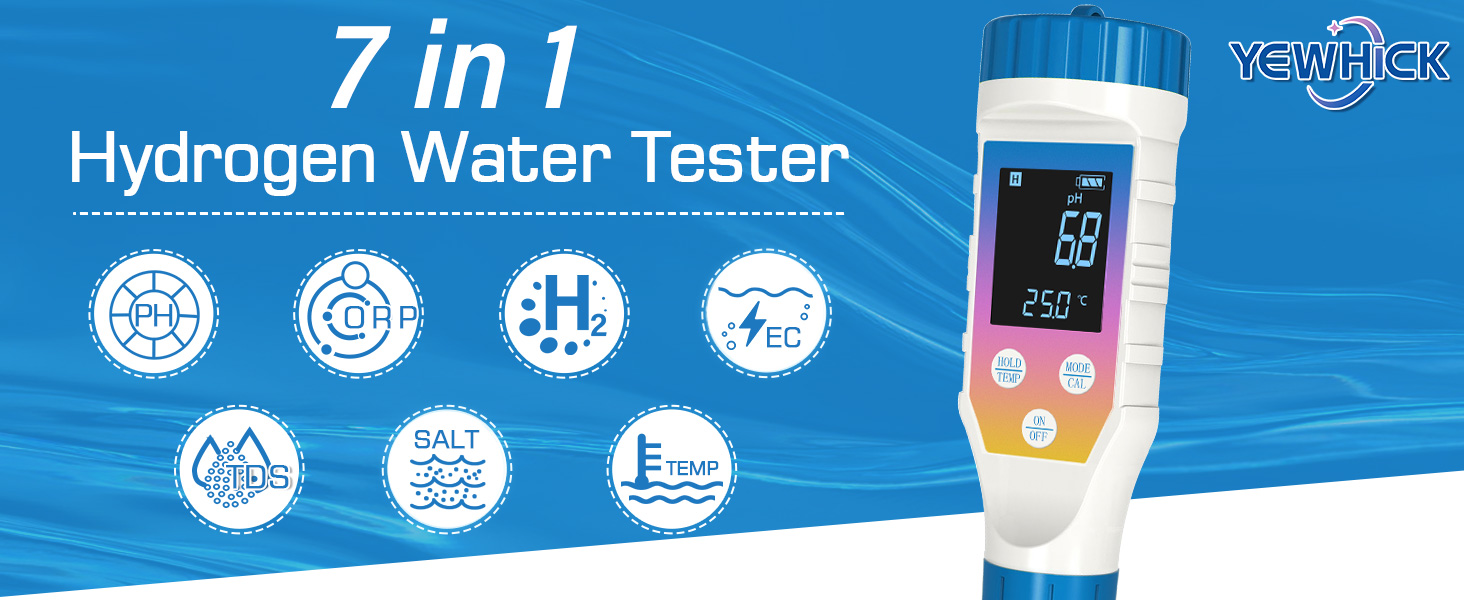 [7-in-1 Multi-functional Water Tester] Yewhick pH Meter accurately measures pH, dissolved hydrogen, ORP, TDS, EC, salinity, and temperature, delivering precise results for all your water testing needs. Ideal for testing various types of water, including bathwater, aquariums, hydrogen-rich water, hydroponic systems, pools, and drinking water.