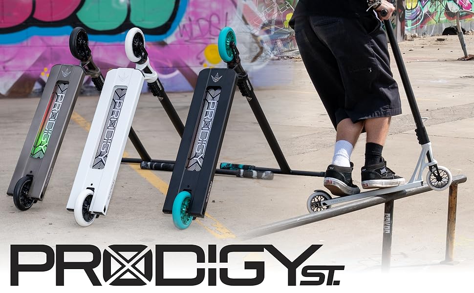 The Prodigy X Street is built on the Prodigy technology with a sold street influence on its parts. This series we kept some of the Prodigy classics - our soft & durable TPR V2 Handgrips and our solid Diamond SCS forks. The rest of the scooter got an overhaul with some MAJOR upgrades. The heart of the scooter is our deck, for the Series X we developed a brand NEW deck extrusion - The Extech extrusion. This extrusion has a stealth lower profile, wider internal walls, boxier construction featuring a high responsive concave. The PX Headtube has been redesigned as well, increasing contact with the deck, a diamond cutout and streamlined profile. The PX Street deck now comes with new dimensions 5.5”W x 21”L and our updated Aluminum Box Ends. The box ends maintain the boxier construction all the way to the end of the deck- perfect for smoother 5-0 grinds. All these features combine to reduce the overall weight and maintain strength. Stacked on top of the new deck we have some upgraded parts. Grip tape with increased grit count for additional grip and durability. V2 Nylon brake system adjusted to fit with our Extech extrusion. The STREET complete is stacked with street parts - Fully Butted T bars, these chromoly bars have varied internal wall thickness' Thick where it needs to be strong and thinner where it doesn't. This maintains the strength of the Steel though reduces the weight dramatically. Essential 4 Bolt SCS Clamp - A streamlined version of our aftermarket OMEN SCS clamp. SCS LOW stack headset compression cap, redesigned to integrate and streamline perfectly with our SCS clamp compression system. All rolling on SECTOR 120mm x 26mm PU wheels 86A with the increased PU width assist with core protection and smoother ride. The complete scooter comes in at a weight of 3.585kg/7.9lbs making it one of the lightest street completes. The Prodigy legacy continues to grow and can always be relied on for quality and performance. For further technical specs please see below.