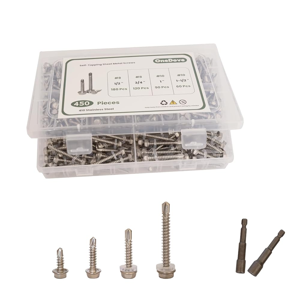 Package Includes: Self-Drilling Screws Assortment (180 Pcs #8 x 1/2", 120 Pcs #8 x 3/4", 90 Pcs #10 x 1", 60 Pcs #10 x 1-1/2") and 2 external hex driver sockets (for #8 & #10 screws).