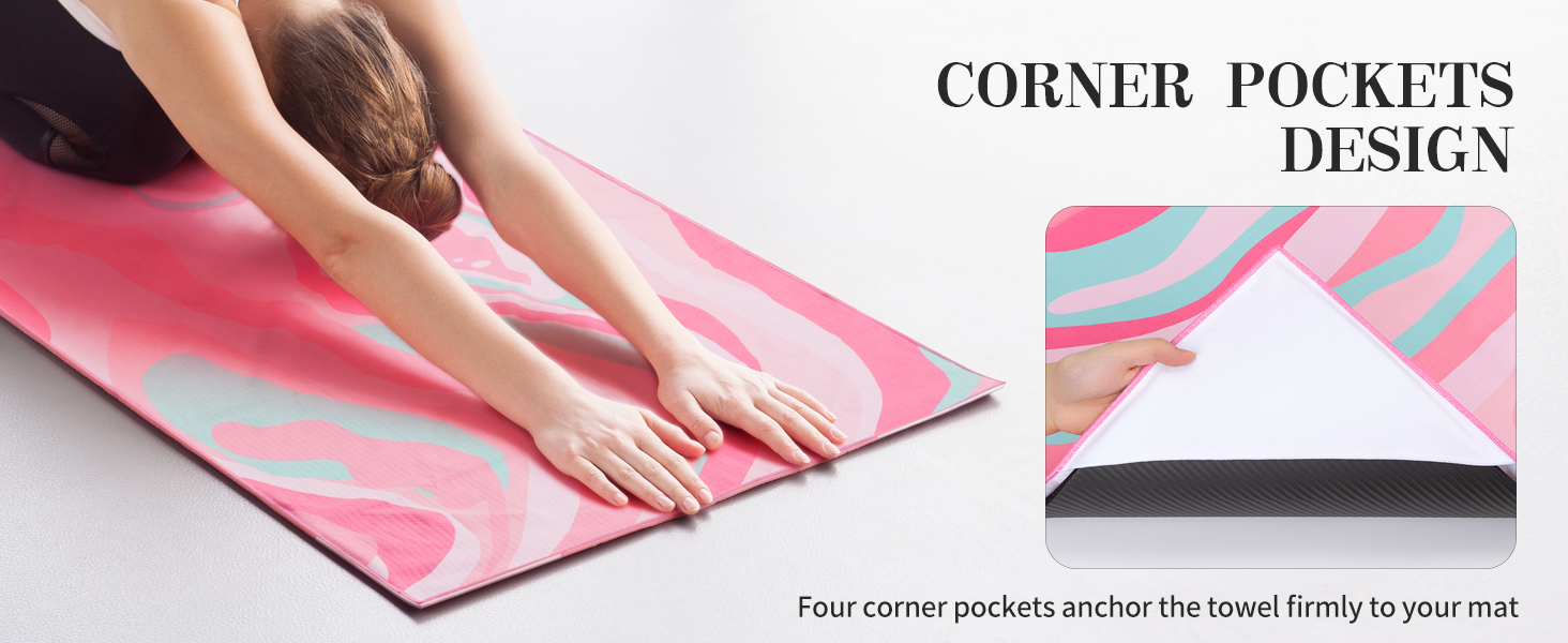 Corner Pocket Design for Stability: Four corner pockets firmly anchor the towel to your yoga mat, ensuring a snug fit and enhanced stability during every practice. Stay fully focused on your poses and feel more confident, without worrying about the towel slipping or shifting