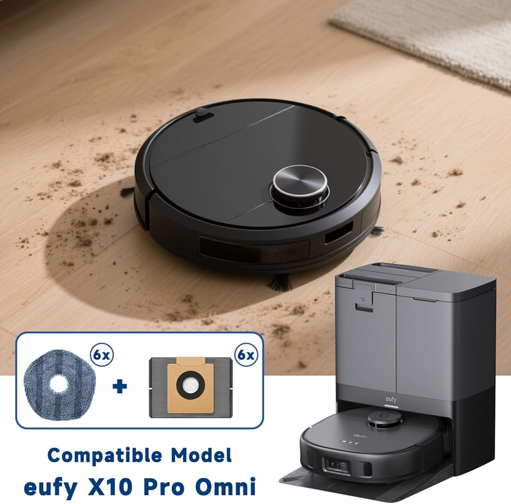This accessory set includes 6 premium mop pads and 6 high-capacity dust bags–everything you need to keep your robot vacuum performing at peak efficiency. Compatible with eufy X10 Pro Omni Robot Vacuum with Self-Empty Station(please confirm your model before ordering).