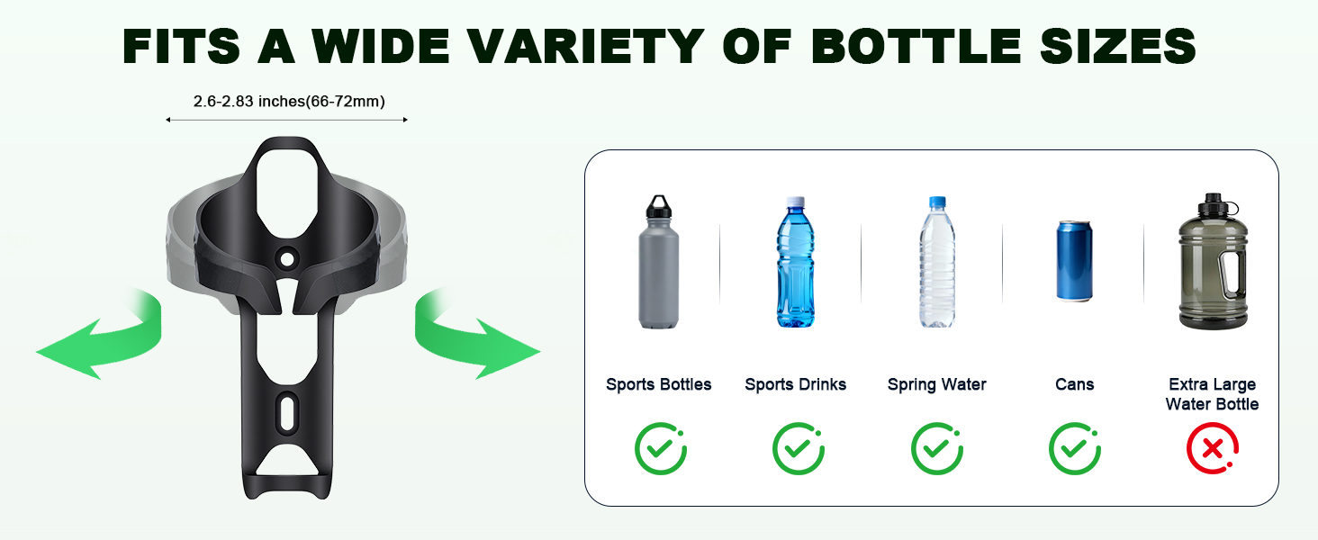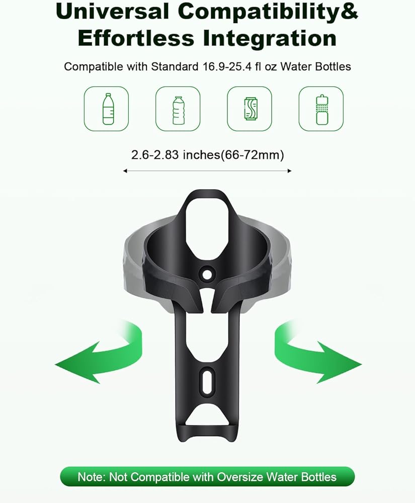 Universal Compatibility:This bike water bottle holder is specifically designed for standard bottles with diameters of 2.6-2.83 inches(66-72mm), compatible with most 16.9-25.4 fl oz(480-720ml)sports bottles and beverage containers on the market (not compatible with oversized bottles).