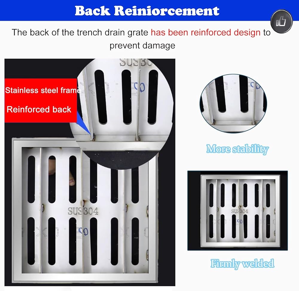 • Introducing our Durable Channel Drain with Back Reinforcement! Engineered for long-lasting performance, this trench drain grate features a reinforced back to enhance durability and prevent damage. Its stable base design ensures reliability, even under uneven force. Ideal for efficient drainage solutions, it effectively channels water while maintaining structural integrity.