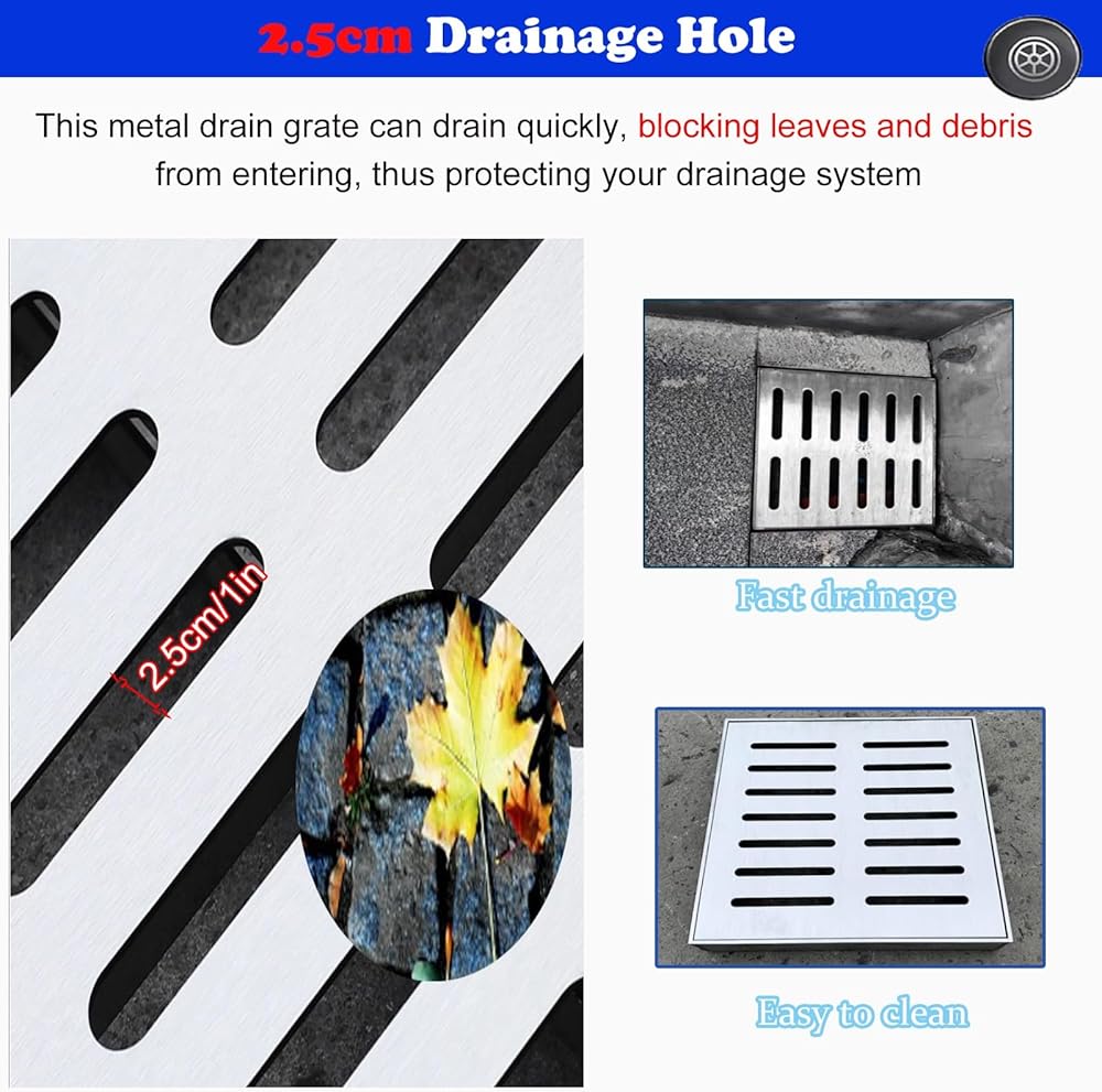 • Stainless Steel Trench Drainage Cover: Crafted from durable stainless steel, this metal drain grate is designed to withstand abrasion and vehicle weight. It effectively prevents water damage to foundations. The 2.5cm/1in design ensures efficient and safe drainage, making it ideal for outdoor use. Enhance your drainage system with this reliable solution.