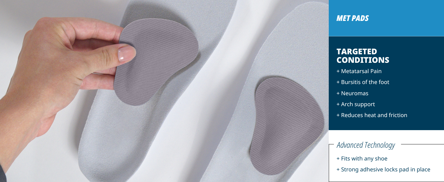 Targeted Metatarsal Support: Engineered metatarsal pads designed to reduce forefoot pressure and pain from metatarsalgia, neuromas, and bursitis.