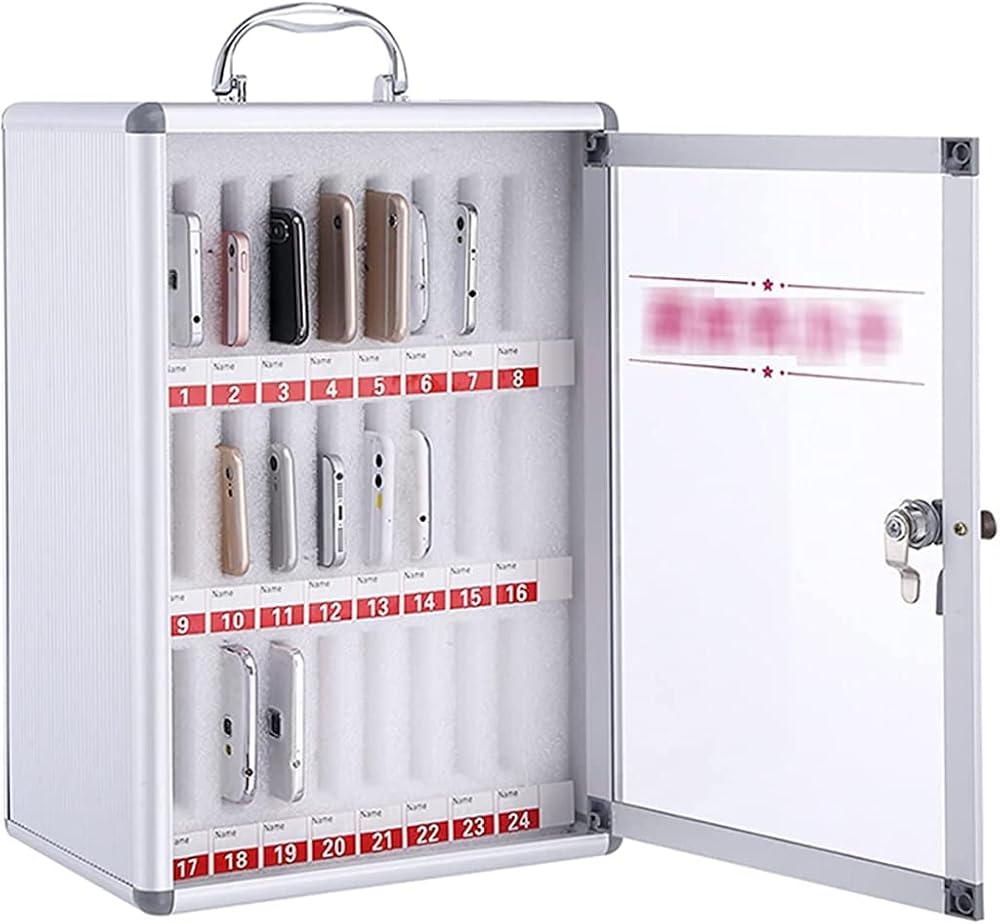 Phone Storage Cabinet School Cell Phone Storage Cabinet Metal Mobile Phone Safe Training Mobile Phone Management Box Suitable for Students with Weak Self-Control,Silver-24 bits