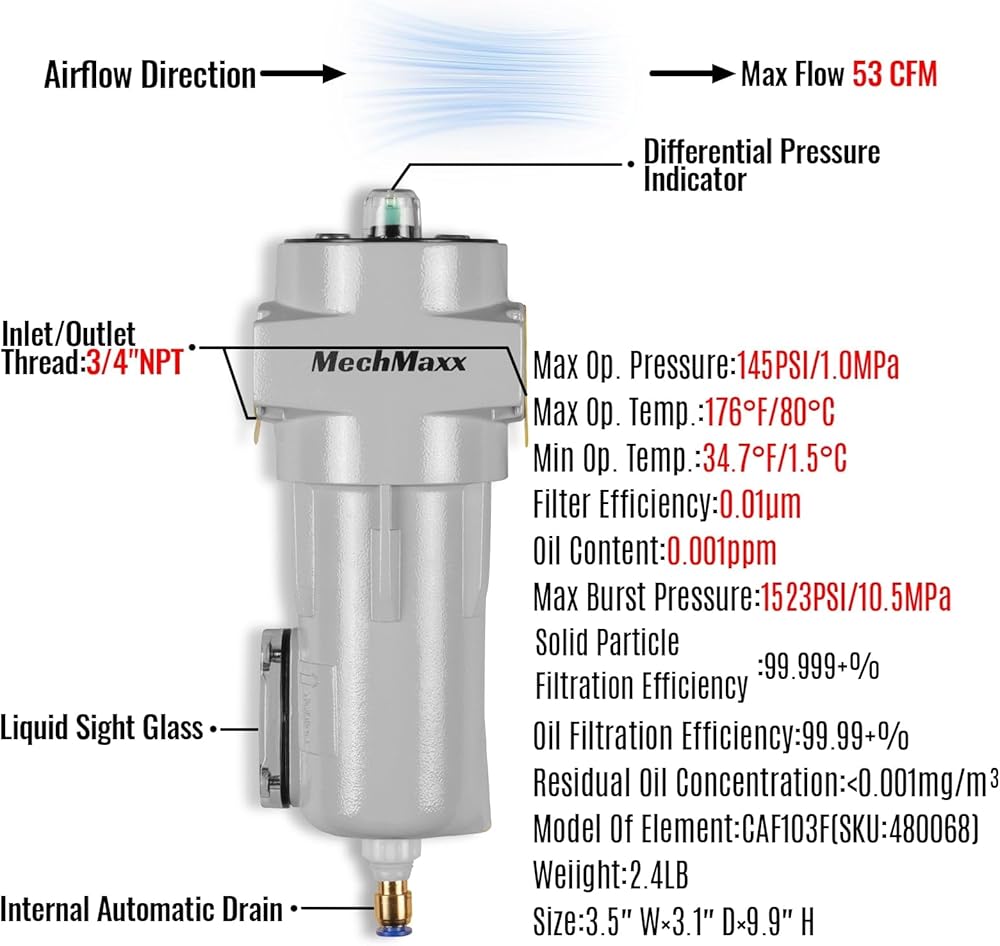 MechMaxx 53 CFM Compressed Air Oil-Water Separator Precision Filter,0.01μm,Oil Content 0.001ppm, With Auto Drain, Pressure Indicator,Recommended for use with M10AC230,Model CAF103
