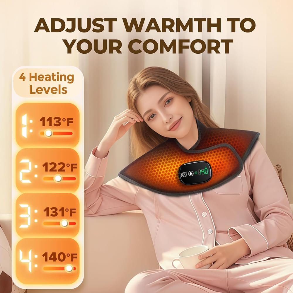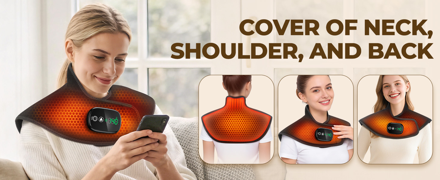 VAST AREA OF SHOULDER & NECK PAIN RELIEF: heated neck and shoulder wrap features 6 adjustable temperatures to promote shoulder and neck circulation, relieving muscle chill and stiffness. While ensuring ample warmth for the neck—a more delicate area—we intentionally set its temperature slightly lower than that for the shoulders, a design choice made out of care for your health. Informed by market research, we have expanded the heated coverage, allowing you to enjoy more extensive warmth. This model now offers the largest heated coverage available in the market for cordless neck shoulder heating pad warmers.